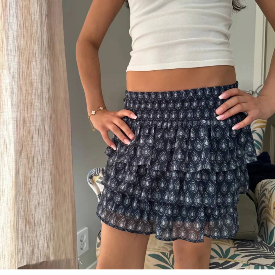 Supersöt mörkblå kortkjol med volanger och droppformat mönster. Kjolen har en stretchig resår i midjan och flera lager volanger som ger en riktigt flowy känsla. Perfekt att styla med en enkel topp och sneakers. 170 barn, men passar även XS, S