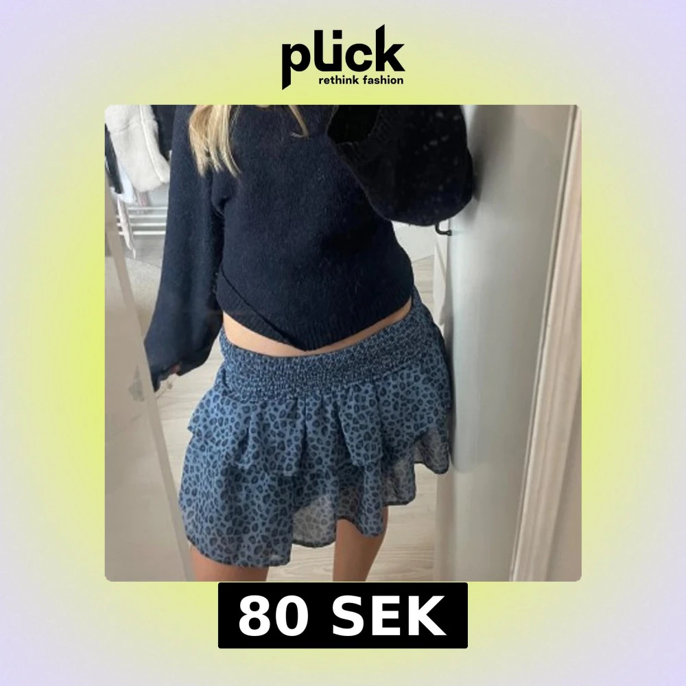 Säljer en blå leopardmönstrad kortkjol med volangdetaljer. Kjolen har en elastisk midja för en bekväm passform. Perfekt för att ge en trendig touch till din outfit!