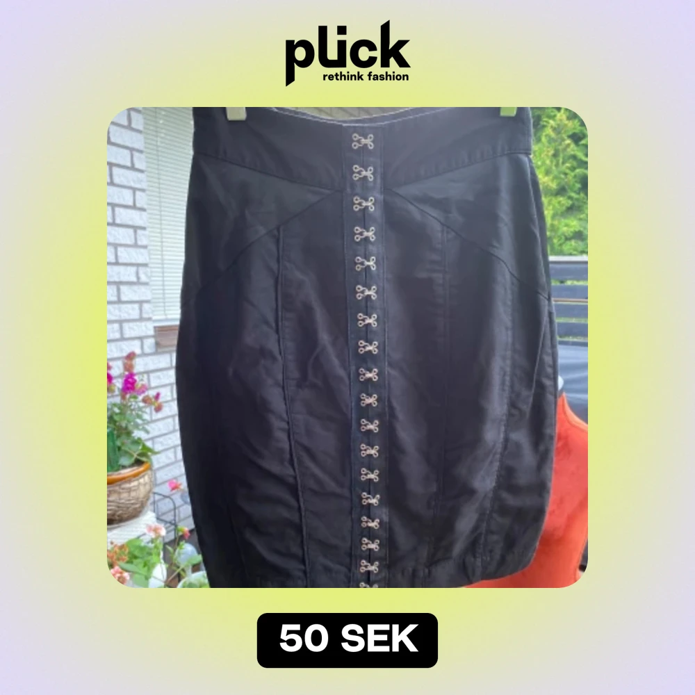 Svart kjol med hyskor där de 4 sista går att öppna upp. Lipsy London, storlek 10 Längd: 51 cm Midjemått: 68 cm Inga bilder när den sitter på mig! Katter finns i hemmet