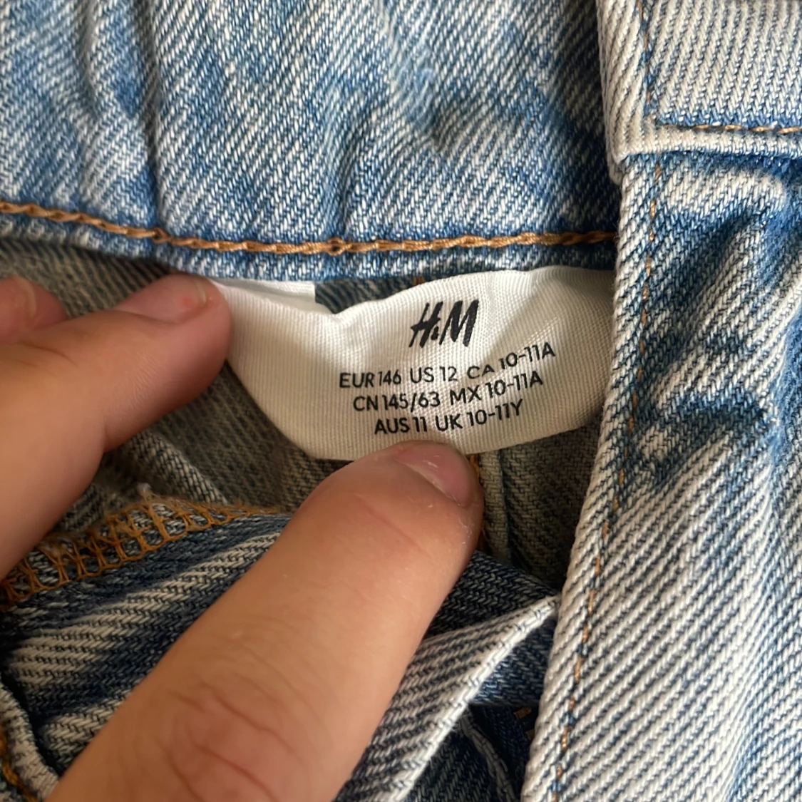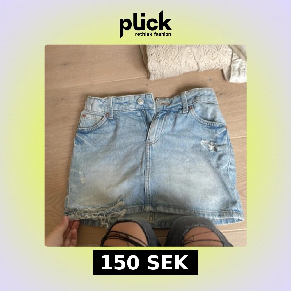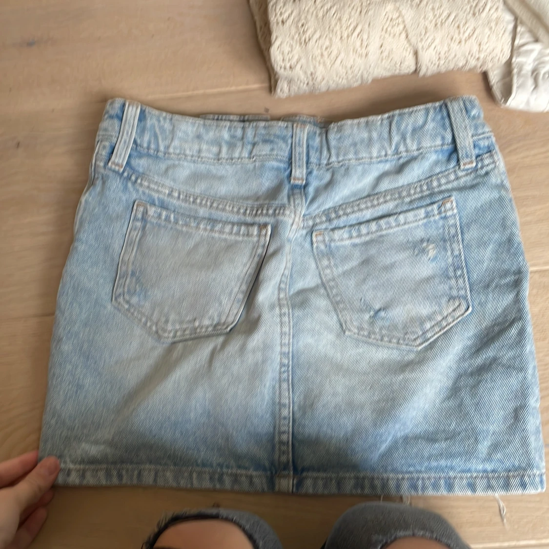 Säljer en ljusblå jeanskjol från H&M med slitna detaljer och fransad nederkant. Kjolen har klassisk femficksdesign, bälteshällor och knappstängning framtill. Perfekt för dig som gillar en avslappnad och trendig denimlook.