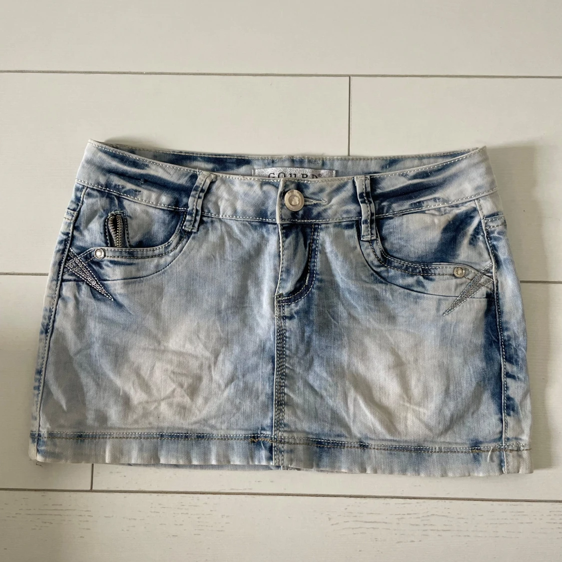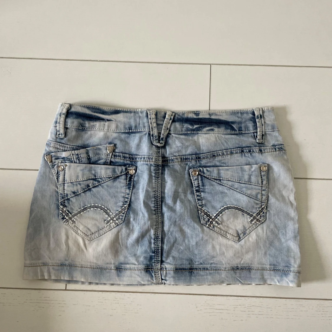 Säljer en ljusblå jeanskjol med snygga slitningar och tvättad effekt. Kjolen har klassiska fem fickor, knapp och dragkedja framtill samt dekorativa sömmar på bakfickorna. Perfekt för en avslappnad och trendig look.