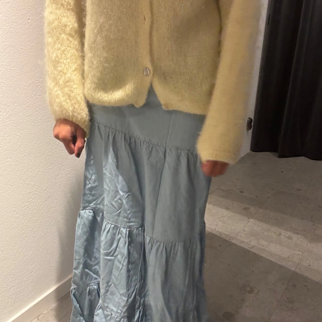 Säljer en ljusblå långkjol med en luftig och flödande design. Kjolen har en mjuk och bekväm passform, perfekt för en avslappnad stil. Den har en elastisk midja för extra komfort❤️❤️❤️