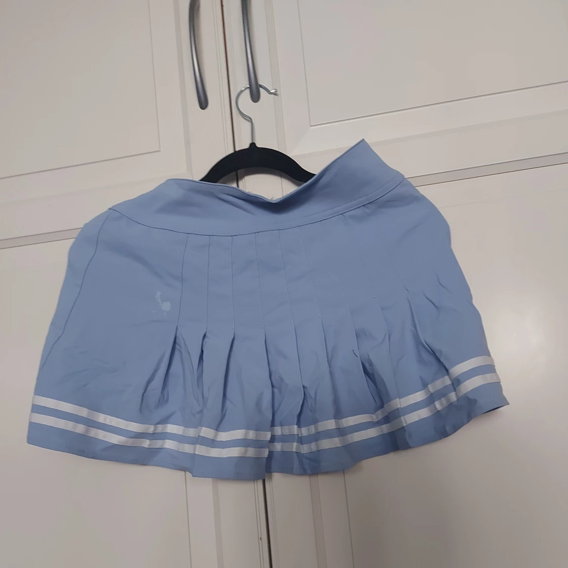 ⚠️ Skriv till mig innan köp!⚠️ Kjolen har en färg fläck!...se sista bilden Annars Superfin ljusblå plisserad kjol från Divided med vita ränder längst ner. Kjolen har dragkedja i sidan och är i kort modell, perfekt för en sportig look. Materialet känns som polyester och den har en klassisk skoluniformsvibe.