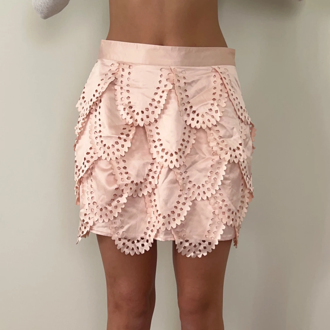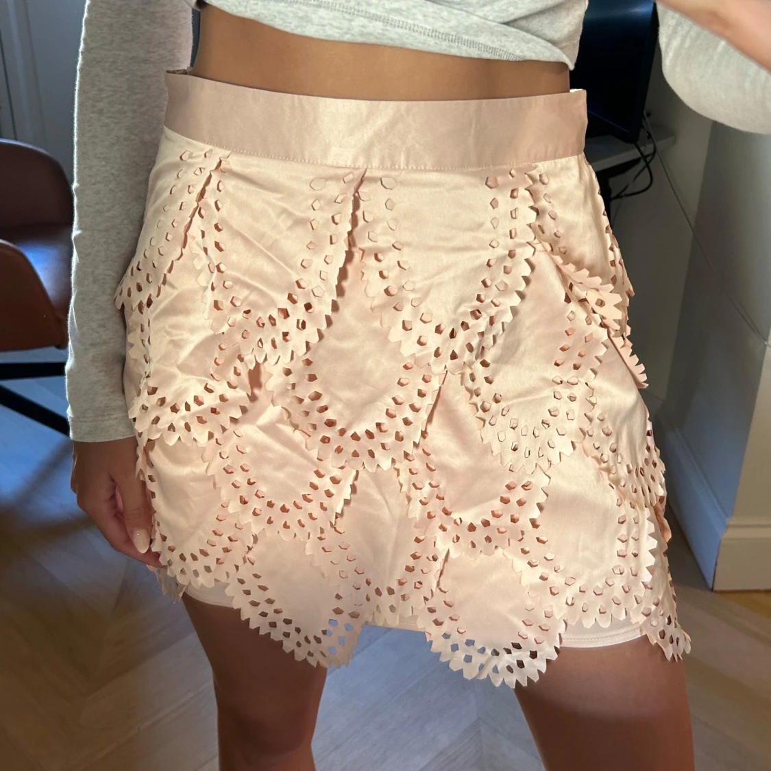 Supersöt ljusrosa kortkjol i satin. Det står storlek 12 i den och passar mig som bär S