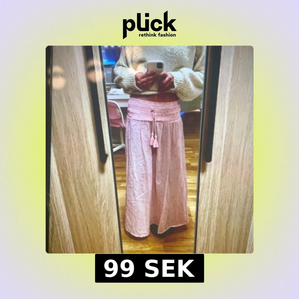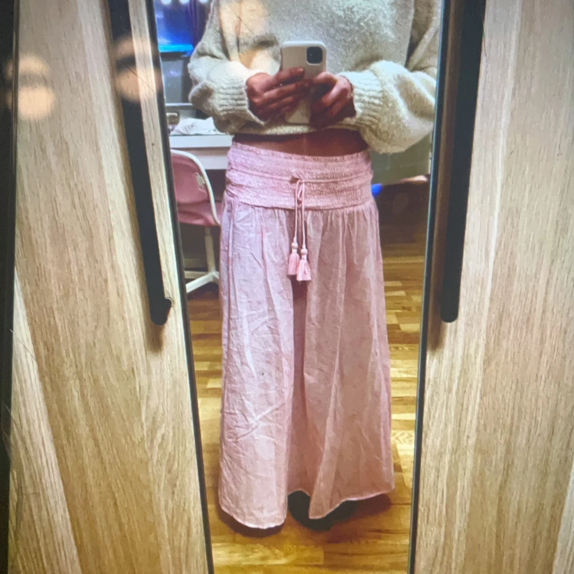Supersöt ljusrosa långkjol med knytband med tofsar framtill. Kjolen är luftig, perfekt för varma dagar. Materialet känns som bomull eller linne!perfekt i storlek,passar också 158-164 i storlek. Bandet gör så att den ser lite knölig ut!😀