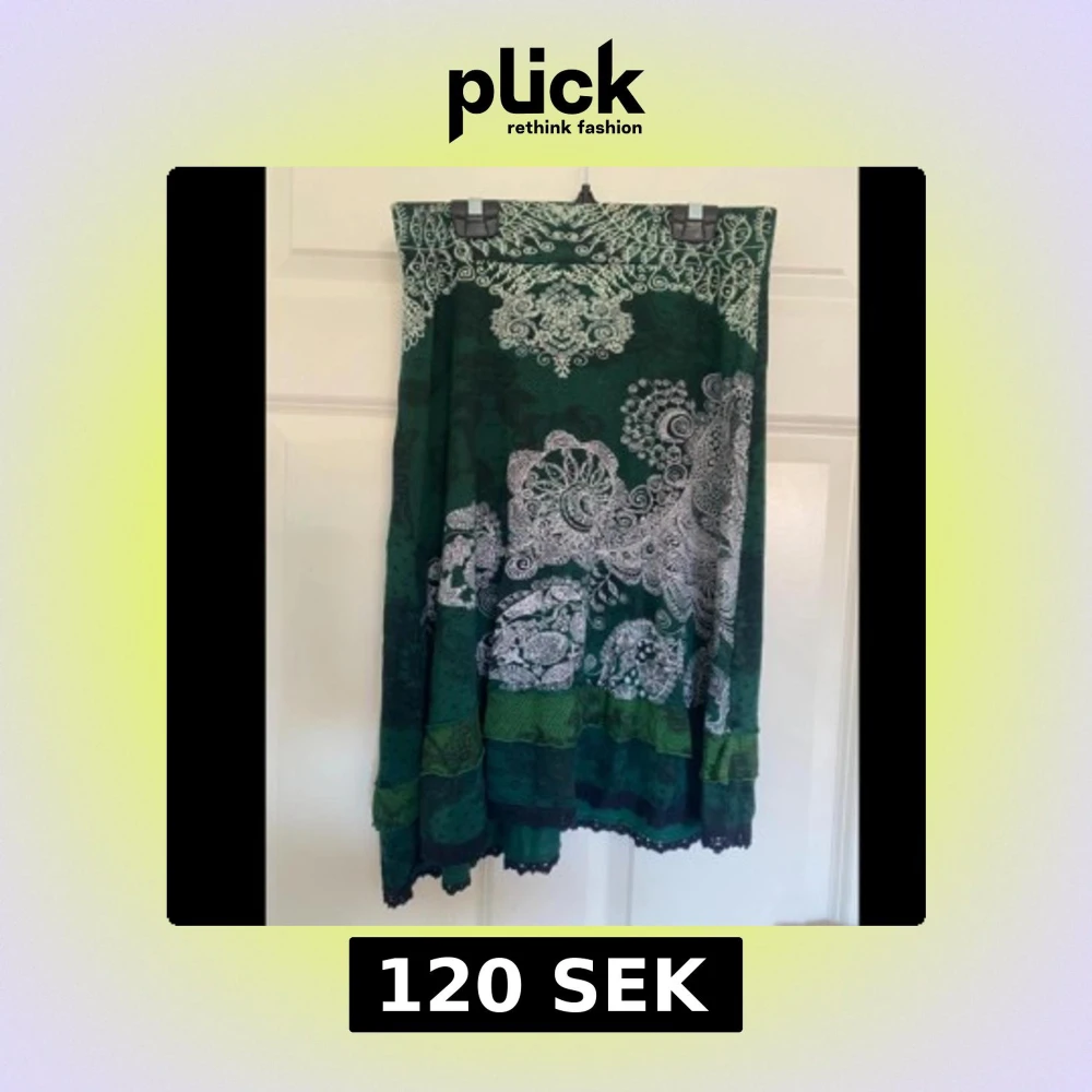 Grön mönstrad kjol från Desigual. Elastisk midja. Köpt secondhand. I storlek M men går att ha även som xs, s och l skulle jag säga.
