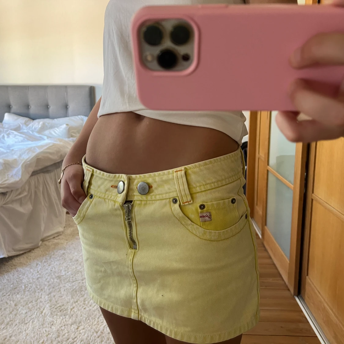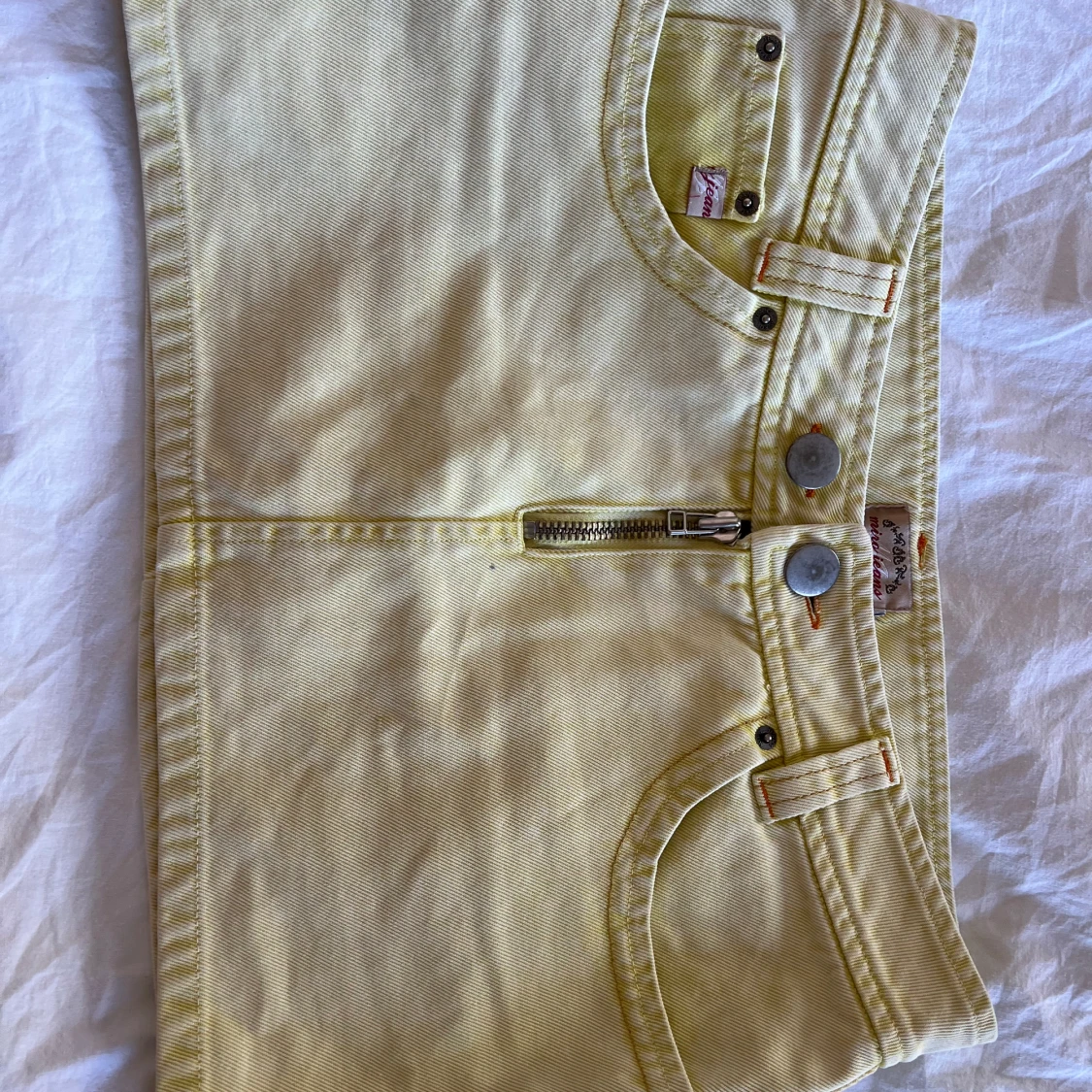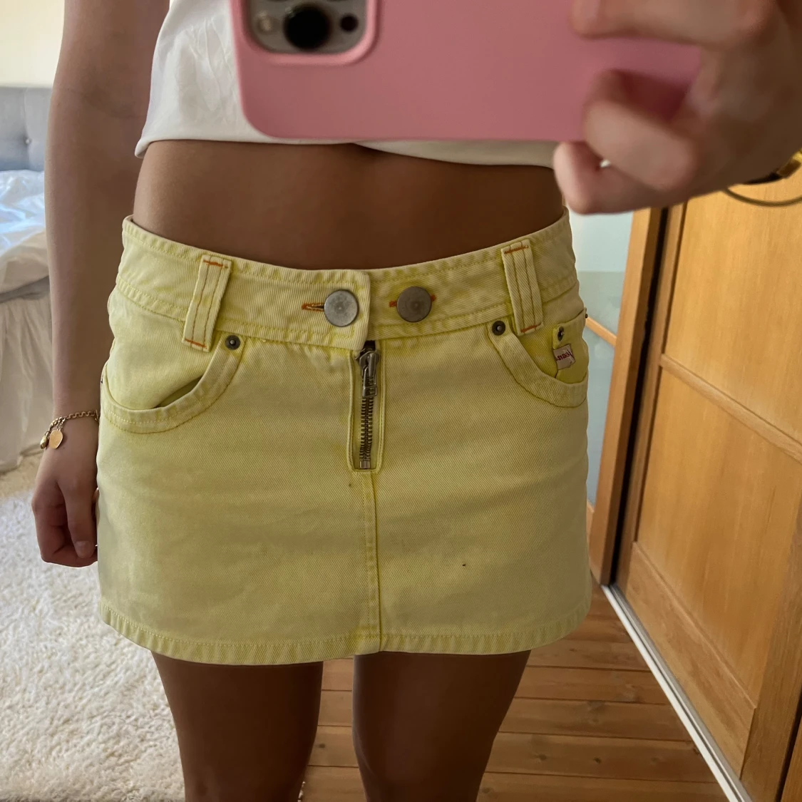 Jättesöt lowwaist gul mini kjol perfekt till sommaren. Justerbar då den har två knappar. Knappen längst ut 40, knappen längst in 38, 31 i längd!💛Buda gärna!