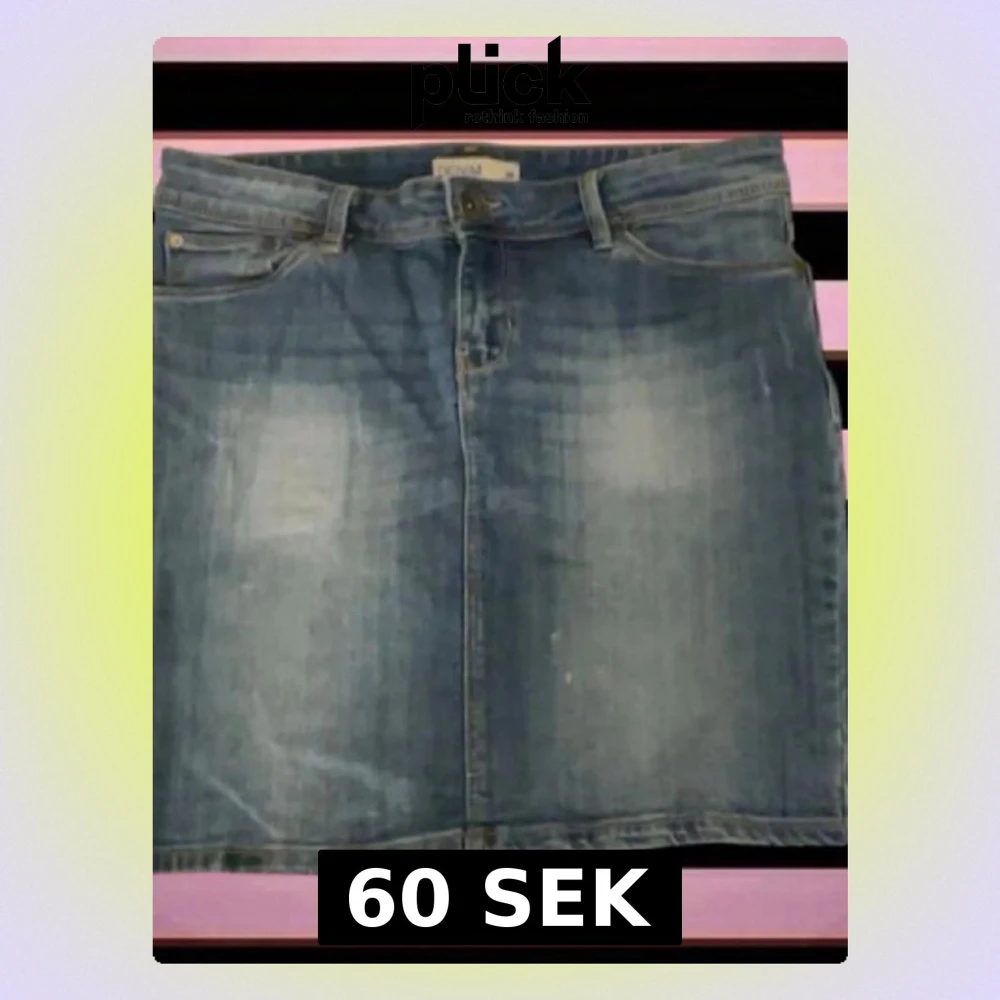 Säljer en klassisk blå jeanskjol i kort modell med fem fickor och bälteshällor. Kjolen har en rak passform och stängs med knapp och dragkedja framtill. Perfekt till vardags för en avslappnad look.