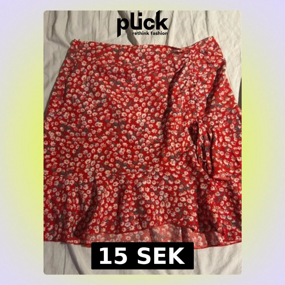 Supersöt röd kortkjol med blommigt mönster och volangdetaljer. Omlottmodell med knyt i sidan och små vita och gula blommor över hela tyget. Ger en färgglad och lekfull känsla perfekt när du vill pigga upp outfiten.(ifrån shein)