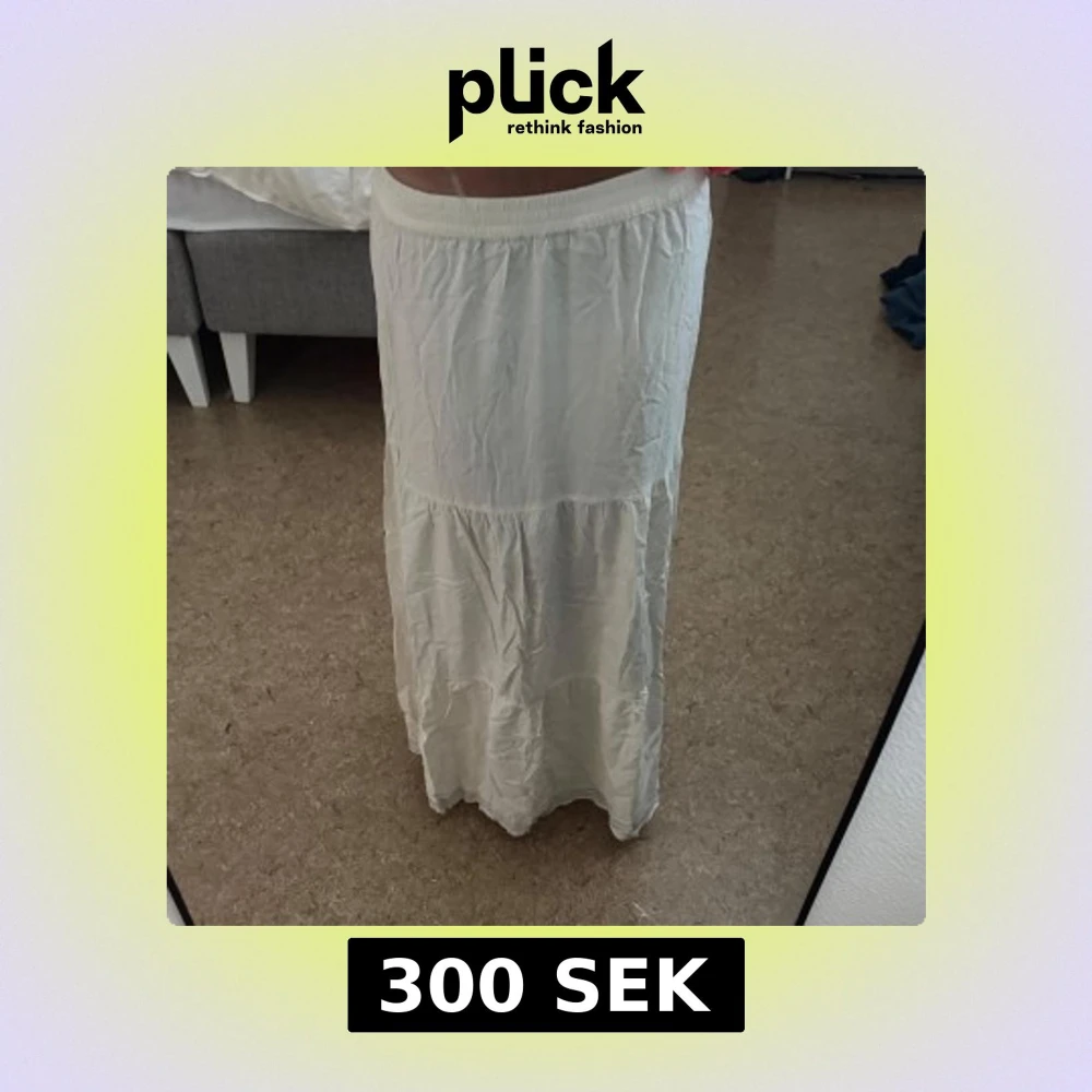 Cremevit långkjol med volangdetaljer och elastisk midja. Kjolen har flera sömmar och svarta dekorativa ränder längst ner. Lätt och flowy känsla, perfekt för varma dagar. Enkel att matcha med olika toppar för en chill och stilren outfit. Tyvärr bara använt en gång, når till marken för mig som är ca 165 med långa ben.