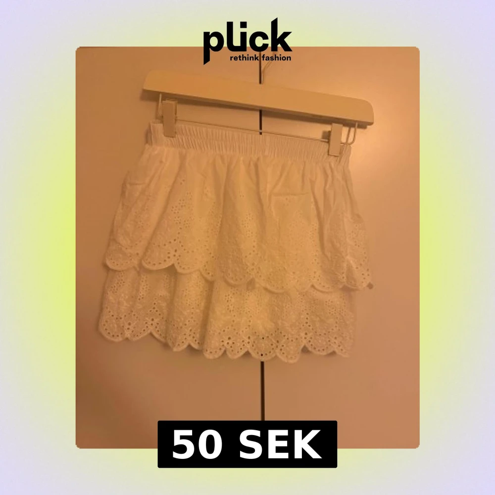 Supersöt vit kortkjol med två lager volanger och broderade spetsdetaljer. Kjolen har elastisk midja och ett romantiskt, luftigt uttryck med scallop-kant. Perfekt för dig som gillar en feminin och fräsch stil.