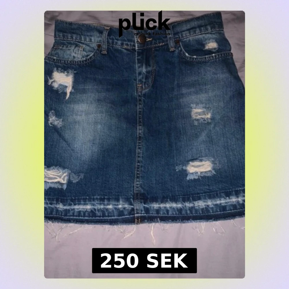 Säljer en blå jeanskjol med coola slitningar och fransad nederkant. Kjolen har klassisk femficksdesign och knappstängning framtill. Perfekt för dig som gillar en avslappnad och trendig stil.