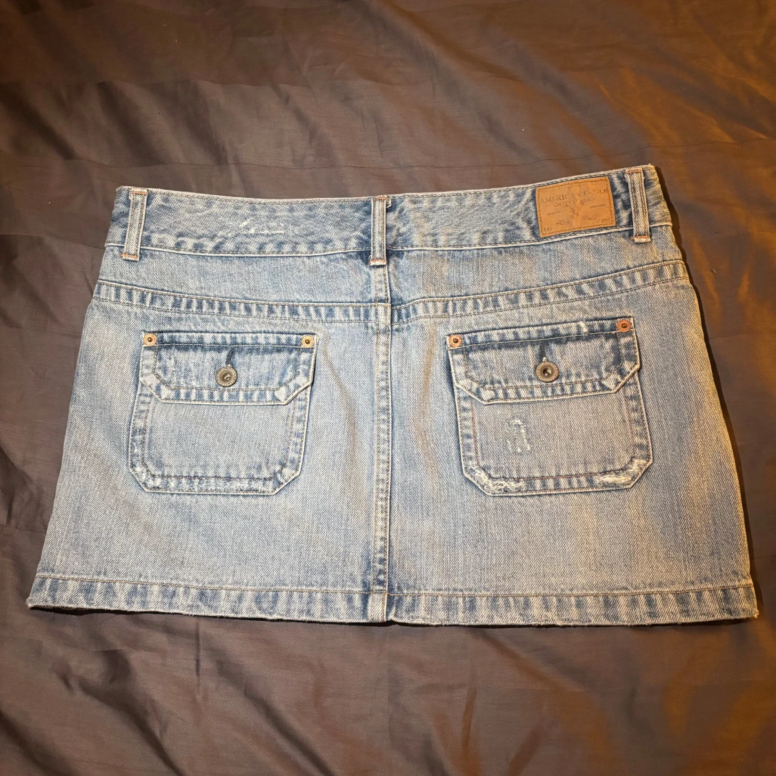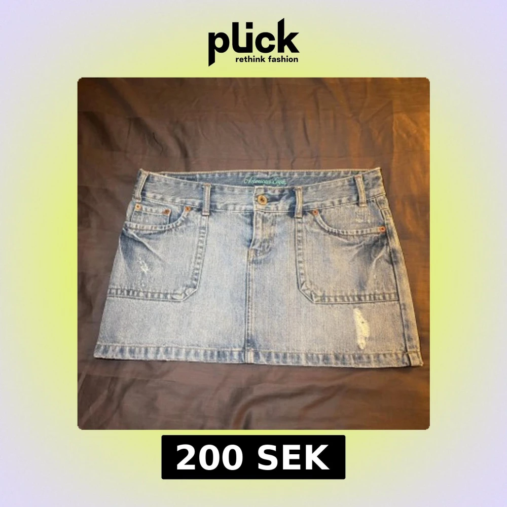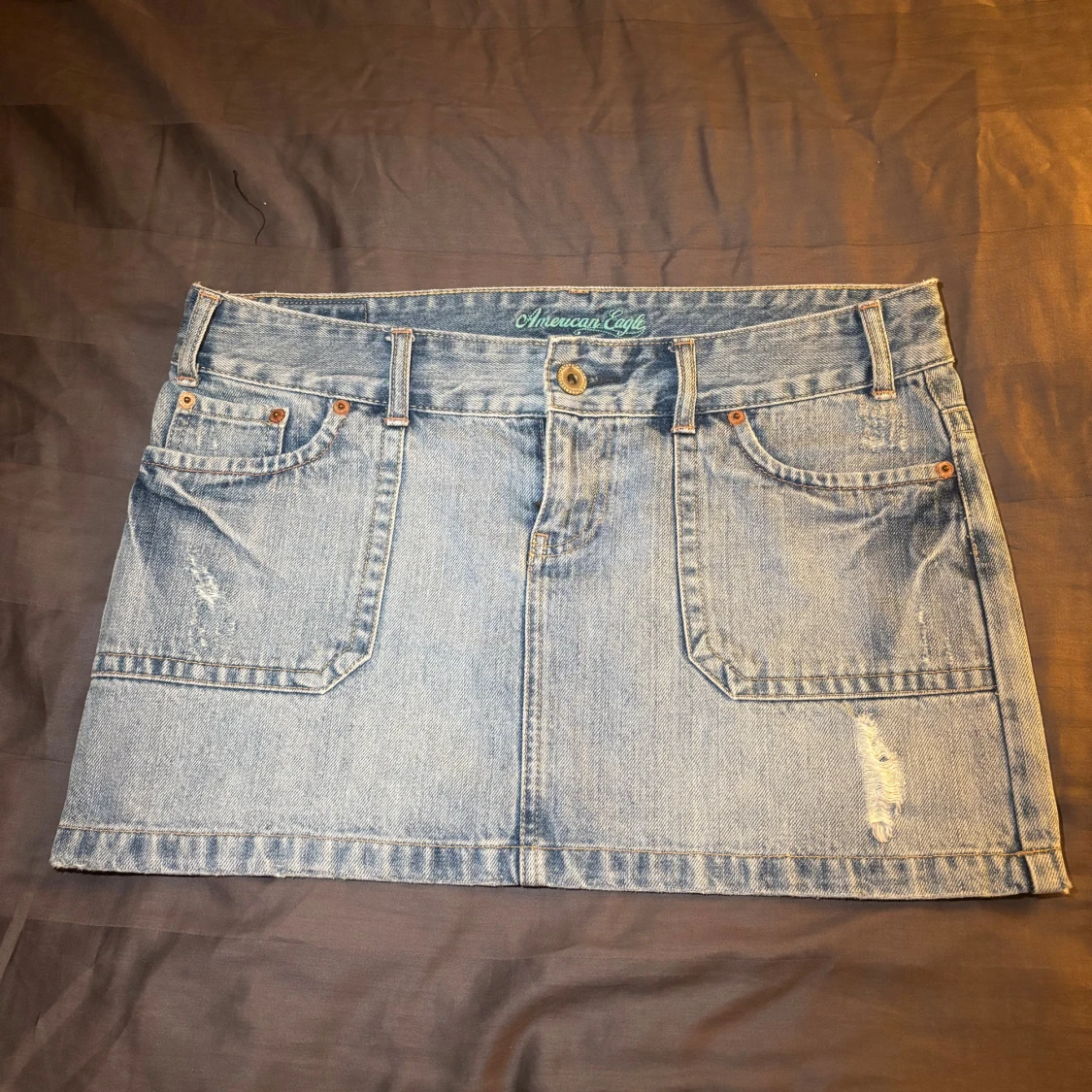 Snygg ljusblå jeanskjol från American Eagle med klassisk femficksdesign, bälteshällor och slitna detaljer framtill. Kjolen är kort och har en rak passform, perfekt till sneakers eller boots. Tidlös denimstil som alltid funkar. Mått: 43cm