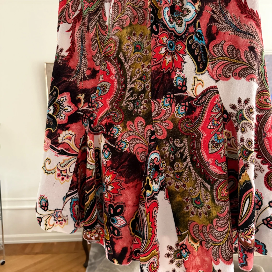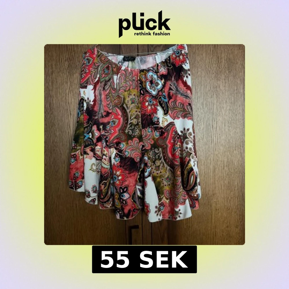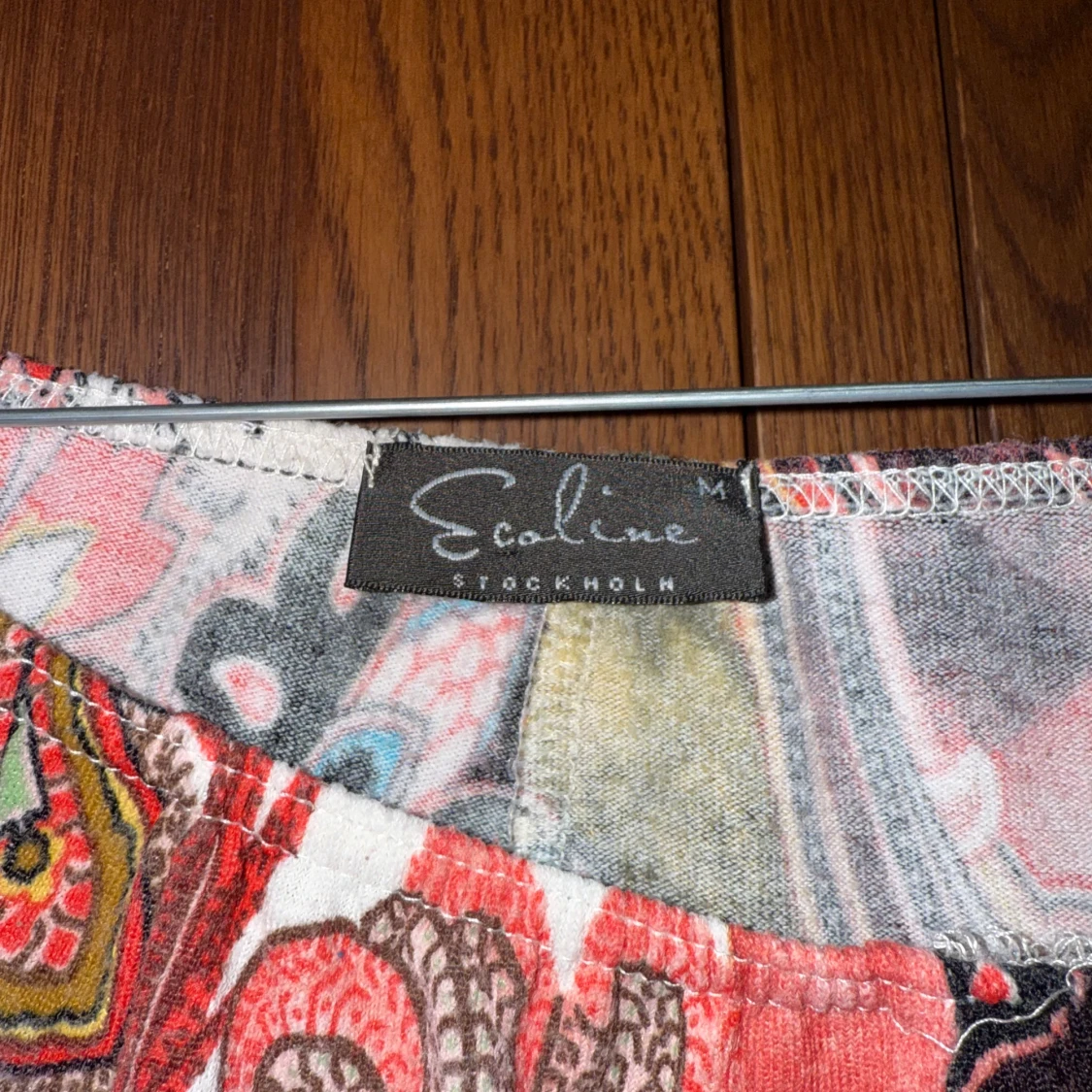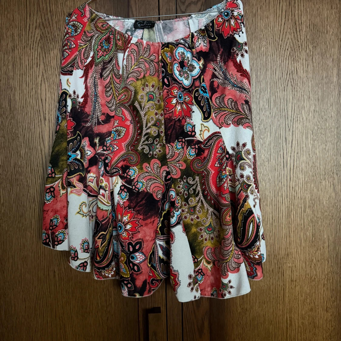 Säljer en kort kjol från Ecaline med färgstarkt paisleymönster i rött, grönt, vitt och mörkt rött. Kjolen har en lätt utsvängd form och är tillverkad i mjuk polyester. Perfekt för dig som gillar unika och bohemiska plagg med mycket färg och detaljer.