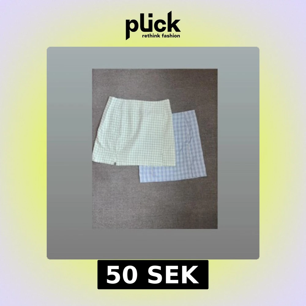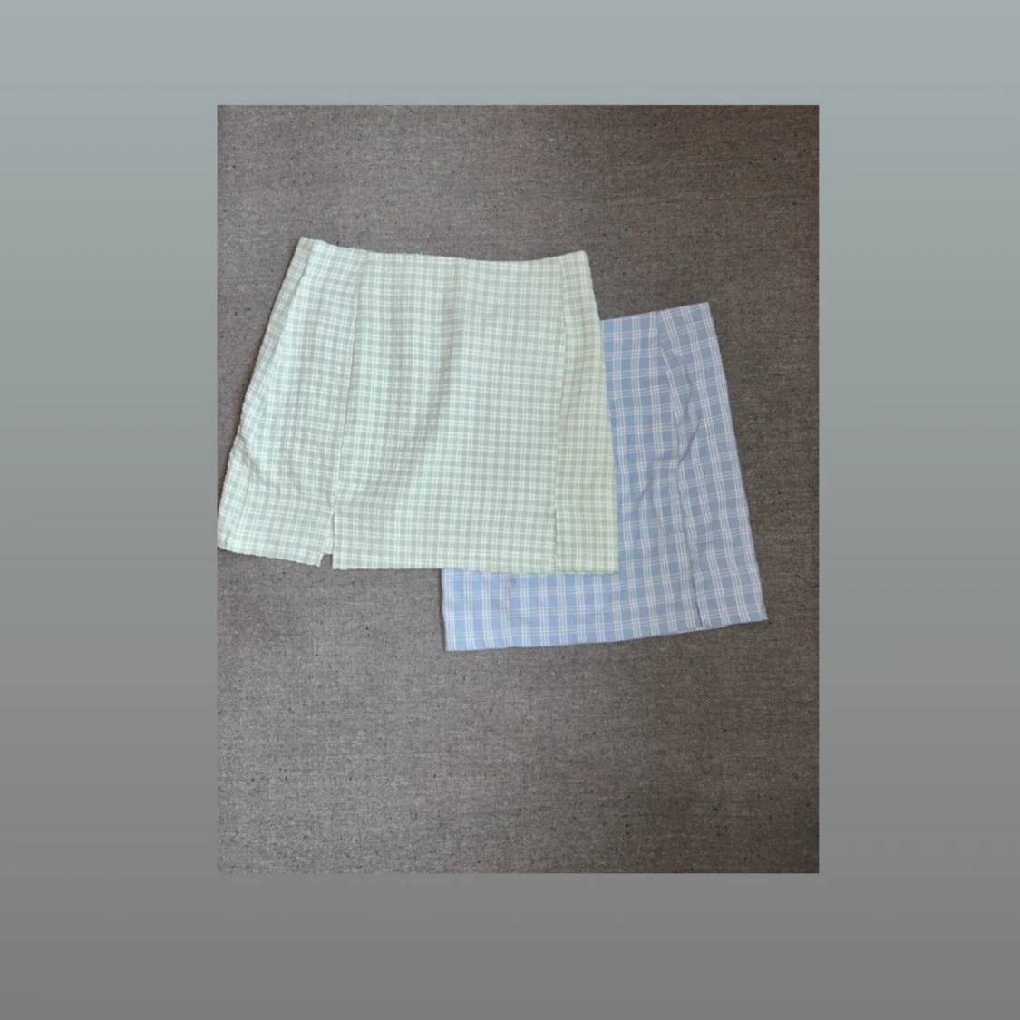 Säljer två superfina kortkjolar i rutigt mönster, en i ljusblått och en i ljusgrönt. Båda har en liten slits framtill och är perfekta för dig som gillar en söt och trendig stil. Kjolarna är raka i modellen och har en fräsch vårkänsla.