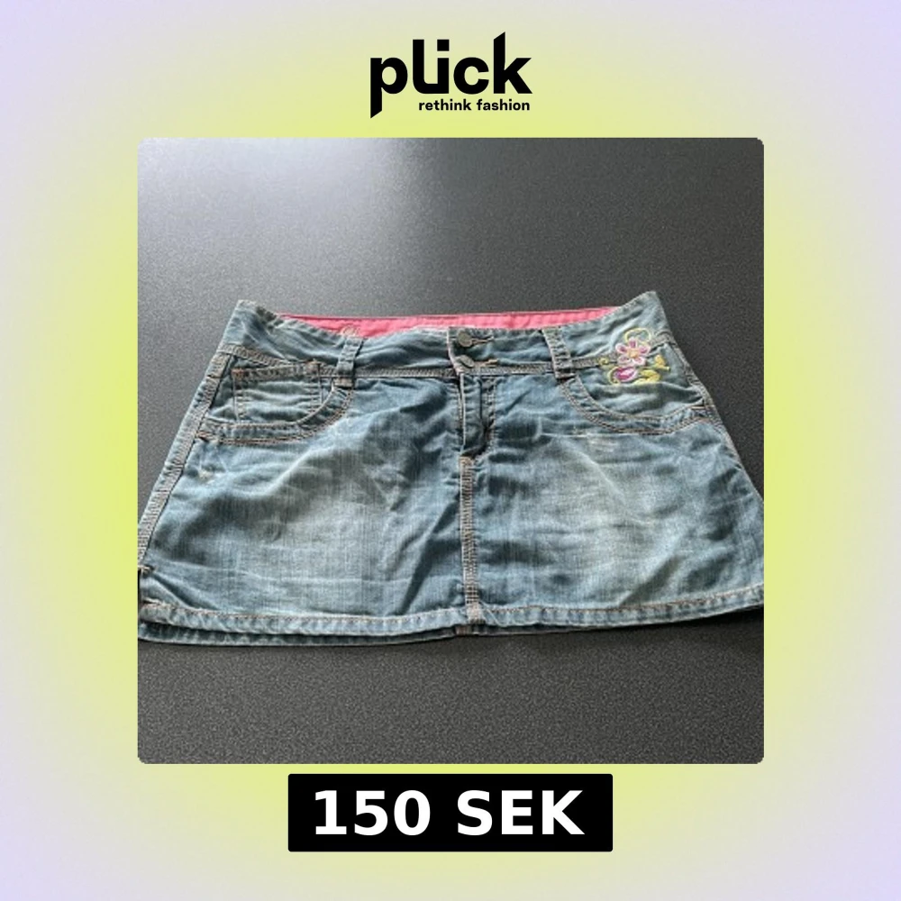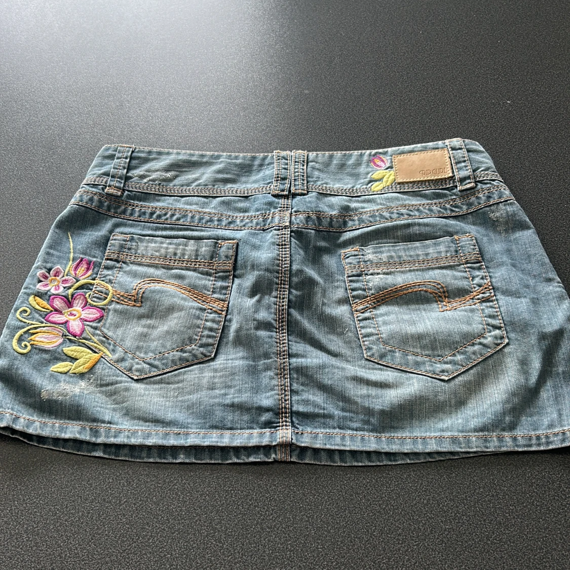 Snygg ljusblå jeanskjol från Rip Curl med broderade blommor i rosa, lila och gult på både fram- och baksida. Kjolen har klassiska jeansfickor, synliga sömmar och små slitsar i sidorna. Perfekt för dig som gillar en chill och färgglad stil.