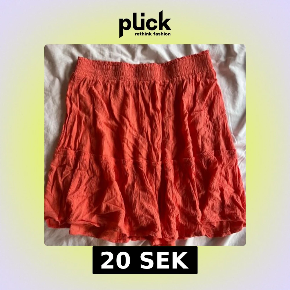 Säljer en korallfärgad kortkjol från Cubus i storlek M. Kjolen har en smockad midja och volangdetaljer.