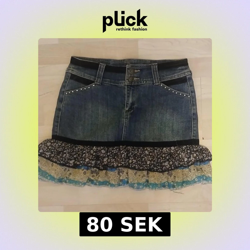 En kort jättesöt jeanskjol med nitar vid fickorna, volanget nertill och svart sammetsdetalj. Den är köpt secondhand och är i storlek M men är lite liten i storlek. Skriv om frågor eller fler bilder. ☺️💖