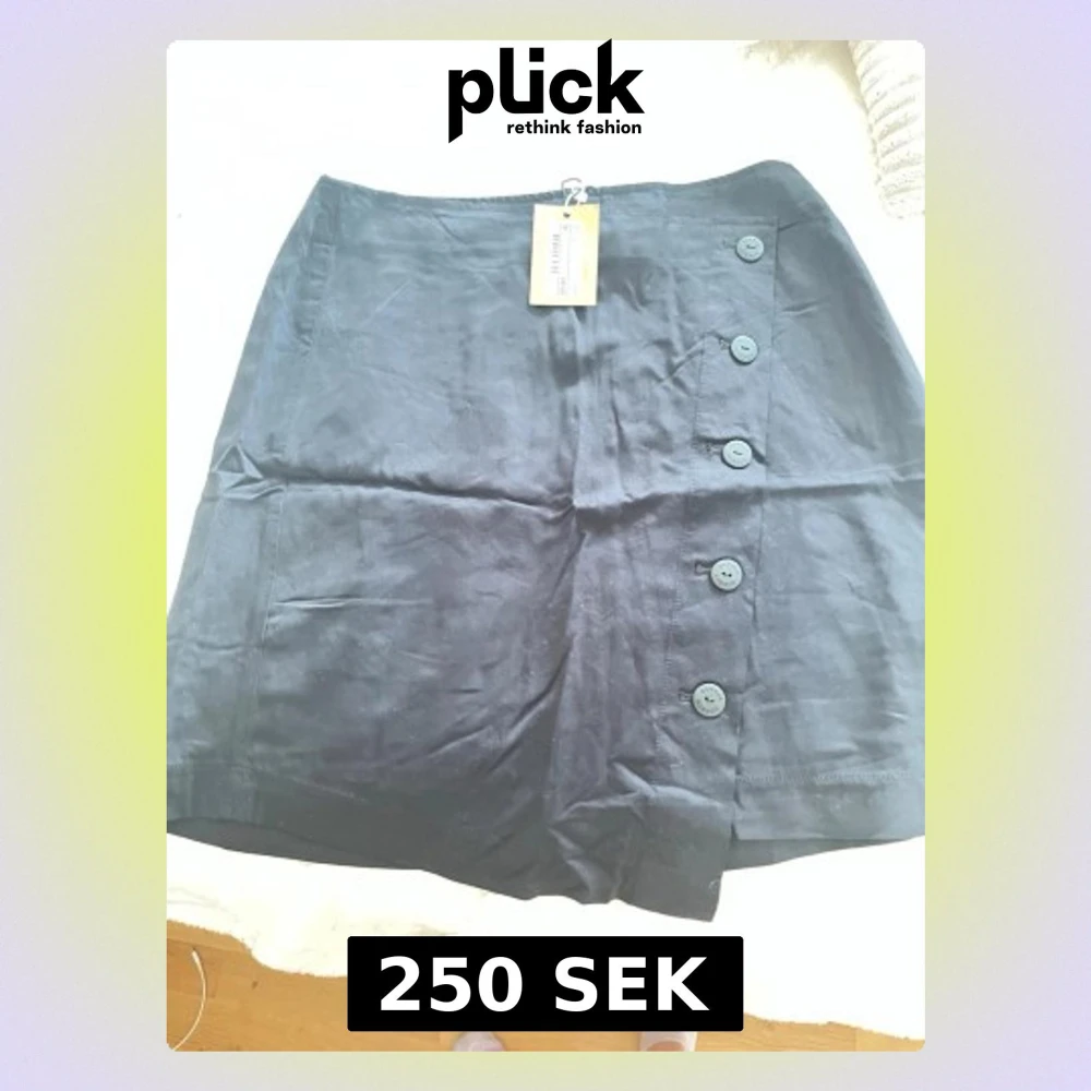 Snygg svart kortkjol i satinliknande material med dekorativa knappar längs sidan. Kjolen har en clean look och passar perfekt till många olika stilar. Enkel att matcha och supertrendig.