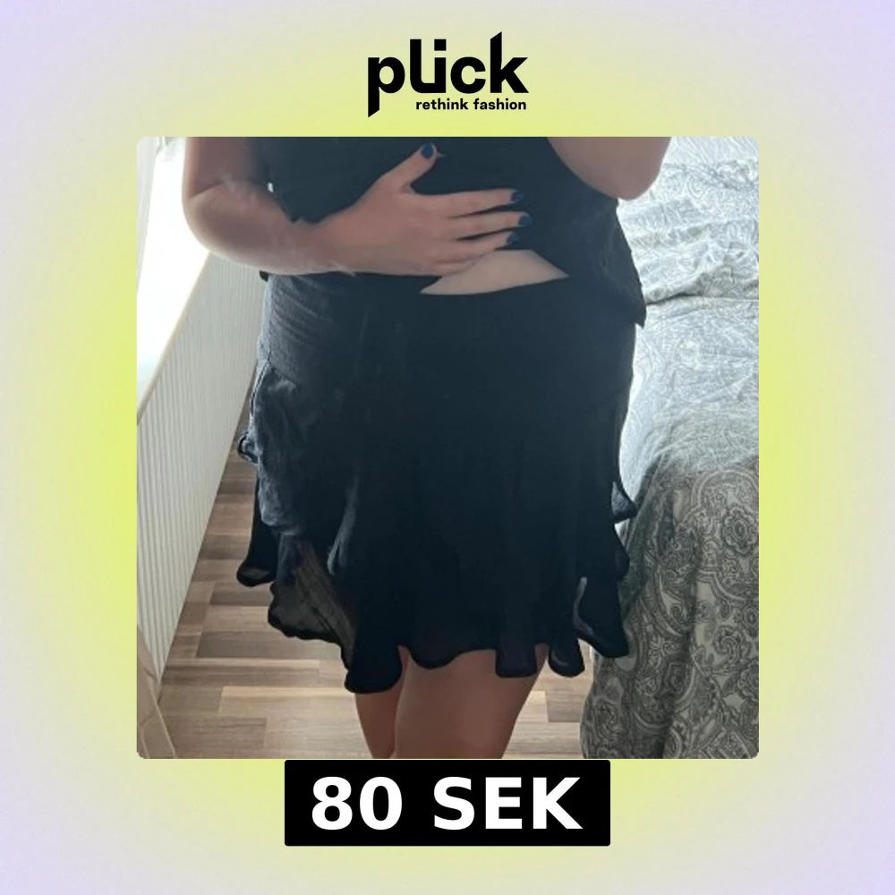 Supersöt svart kortkjol med volangkant och lätt omlottkänsla. Kjolen har en flowy passform och är perfekt för dig som gillar en feminin och trendig stil. Materialet känns lätt och luftigt, vilket gör den skön att bära under varma dagar.