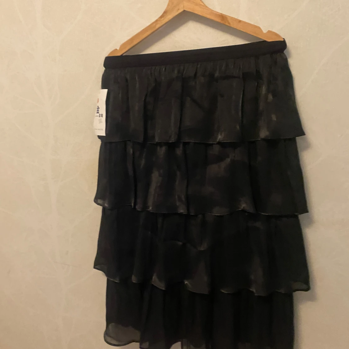 Säljer hell ny,Snygg svart långkjol med flera lager volanger och bred resår i midjan. Kjolen har en lätt glansig yta och faller riktigt fint. Perfekt för dig som vill ha en statement piece i garderoben. Storlek M
