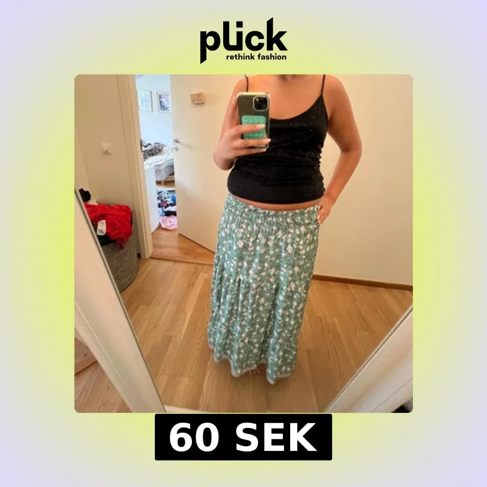 Säljer en flowy grön långkjol med blommigt mönster i vitt, rosa och blått. Kjolen har bred resår i midjan och volangdetaljer som ger extra rörelse. Perfekt för dig som gillar boho-vibe och vill ha något luftigt och färgglatt till sommaren.