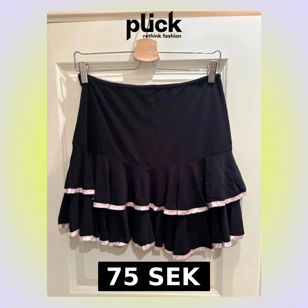 Snygg svart kortkjol från Glitzy London med dubbla volanger och ljusrosa kantdetaljer. Kjolen har en feminin och lekfull look, perfekt att styla med en enkel topp eller hoodie. Tillverkad i mjukt och följsamt material.