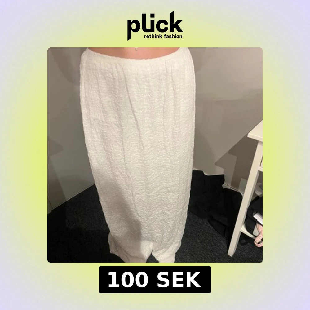 Säljer en vit långkjol med krinklad struktur och resår i midjan. Kjolen har en rak passform och är tillverkad i ett lätt material som passar perfekt till varmare dagar.