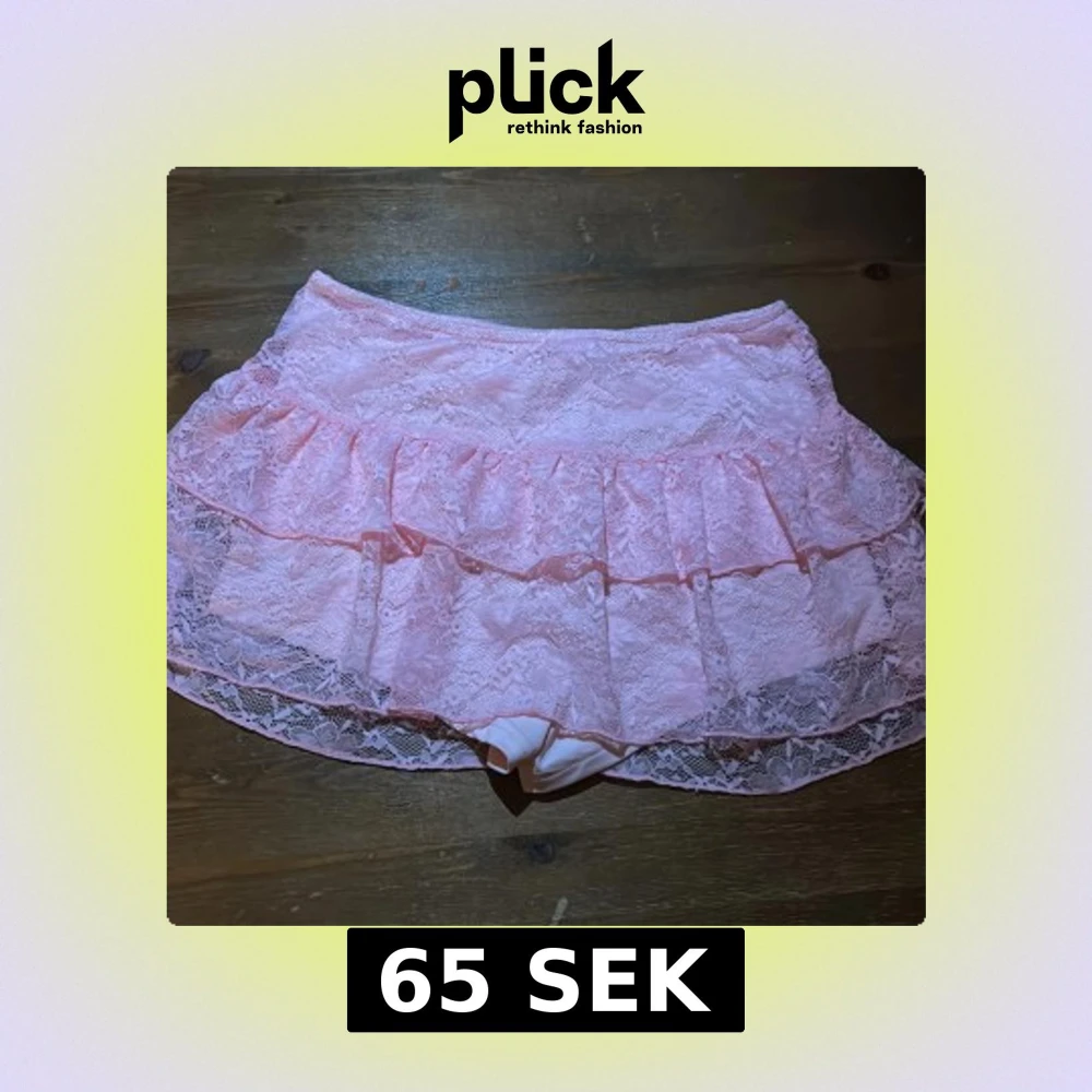 Supersöt kortkjol i ljusrosa spets med volanger och inbyggda shorts under. Kjolen har ett romantiskt uttryck med blommig spets och volangdetaljer som ger extra fluff. Perfekt för dig som gillar gulliga och lekfulla plagg. Aldrig använd.