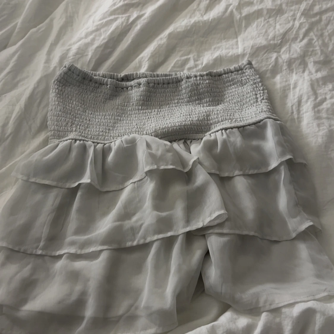 Superfina vita shorts med bred smock i midjan och flera lager volanger som ger en flowy och luftig känsla. Perfekta för varma dagar när du vill ha något både bekvämt och snyggt. Lätta och tunna i materialet, passar perfekt till sommarens outfits.