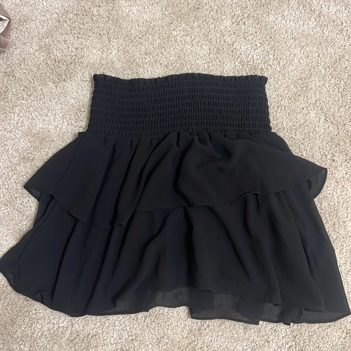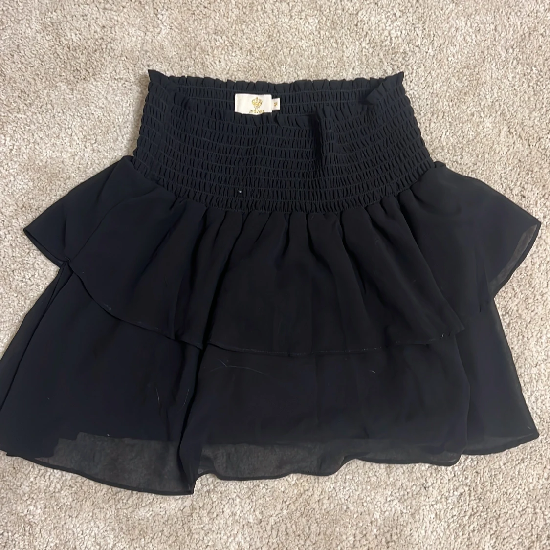 Snygg svart kjol med volangdetaljer från Made by Chelsea. Kjolen har en elastisk midja som ger en bekväm passform. Nypris 500 kr