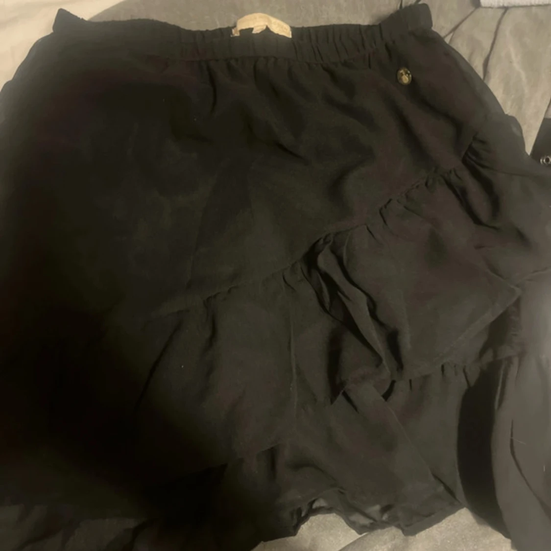 Supersöt svart kortkjol med volangdetaljer och resår i midjan. Kjolen har en flowy känsla och passar perfekt till en trendig look. Enkel att matcha med både sneakers och boots för en cool vibe.