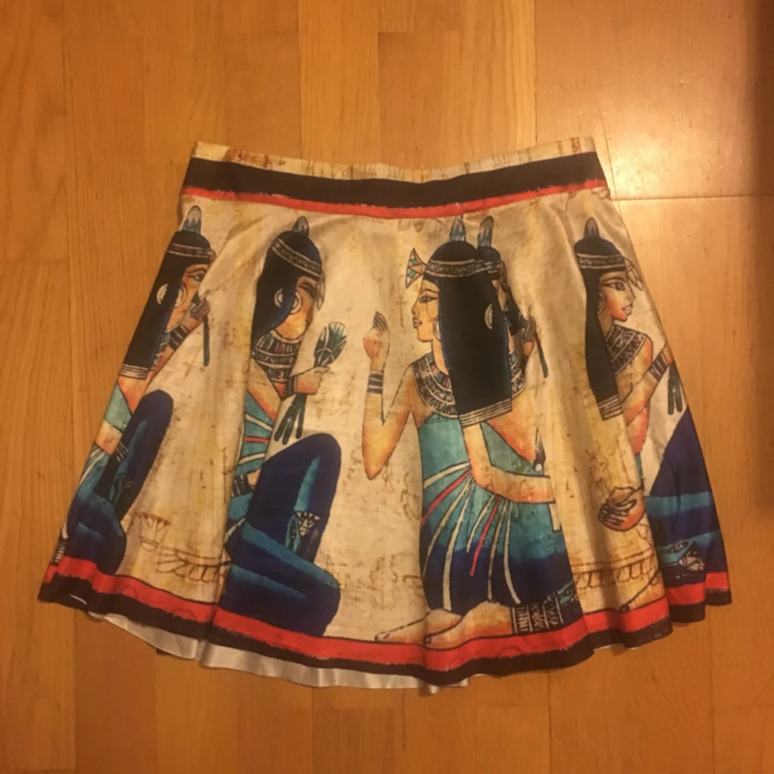 Kjol med mönster, i mycket stretch, står ingen storlek i men uppskattar den till S-M. I lixom ''baddräktsmaterial''. Aldrig använd!