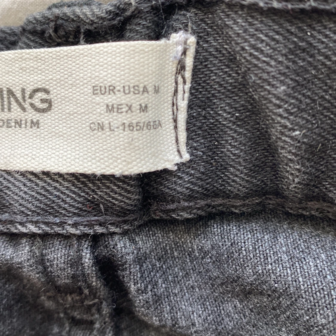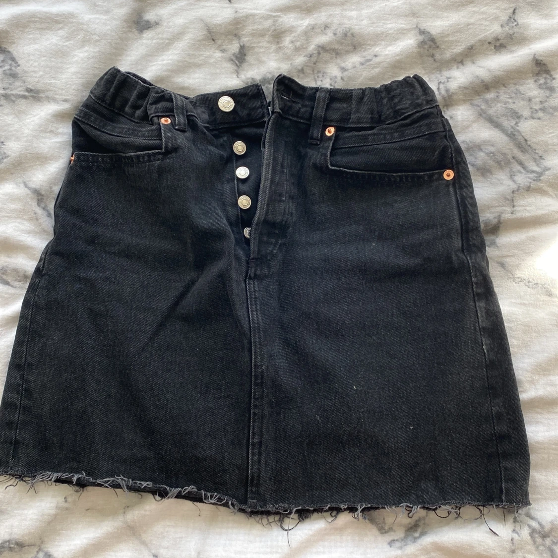 En skön jenas kjol. I färgen ljus svart. Rätt så kort i längden. Sitter över magen.