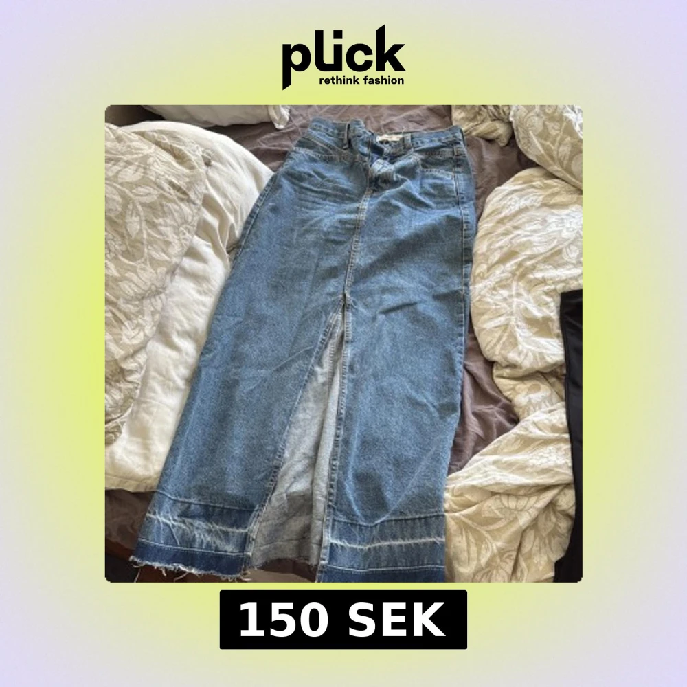 Säljer en snygg lång jeanskjol i klassisk blå denim. Kjolen har en hög midja, markerade sömmar och en tydlig slits framtill för en cool look. Perfekt att styla med sneakers eller boots.