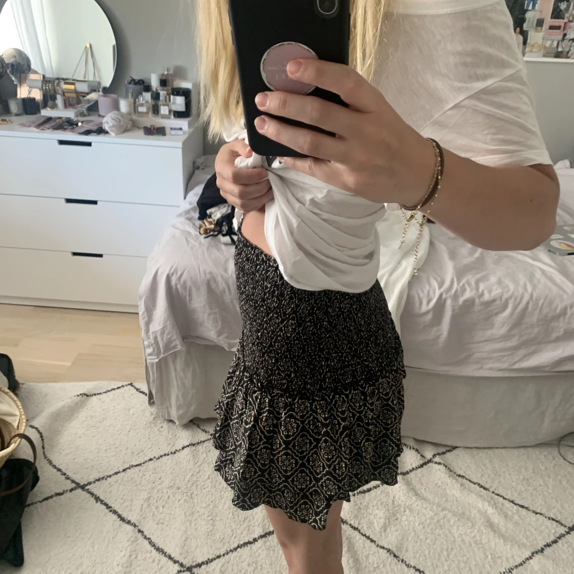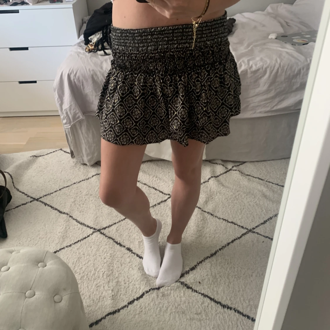Säljer den här såå söta kjolen med volanger från zara!! Så gullig till typ en vit blus!! Storlek M men passar lika bra mig som brukar ha XS!!! Den är ganska högmidjad med går att vika ner till lågmidjat!!