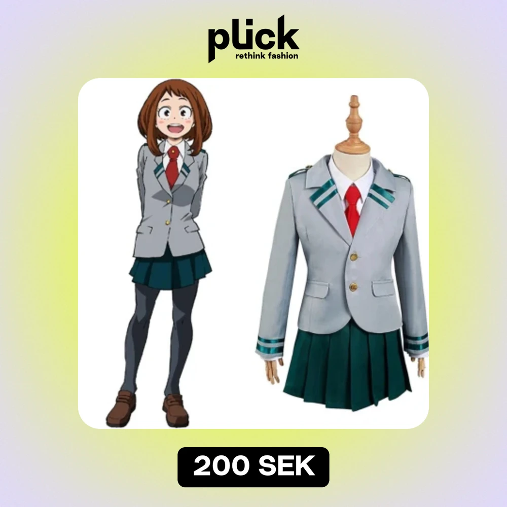 Säljer min uniform från BNHA, hade tänkt cosplaya Uraraka men den har bara suttit i garderoben alldeles för länge. (KJOL, INTE BYXOR.) Allt ingår utom peruk. Köpare betalar frakt separat!