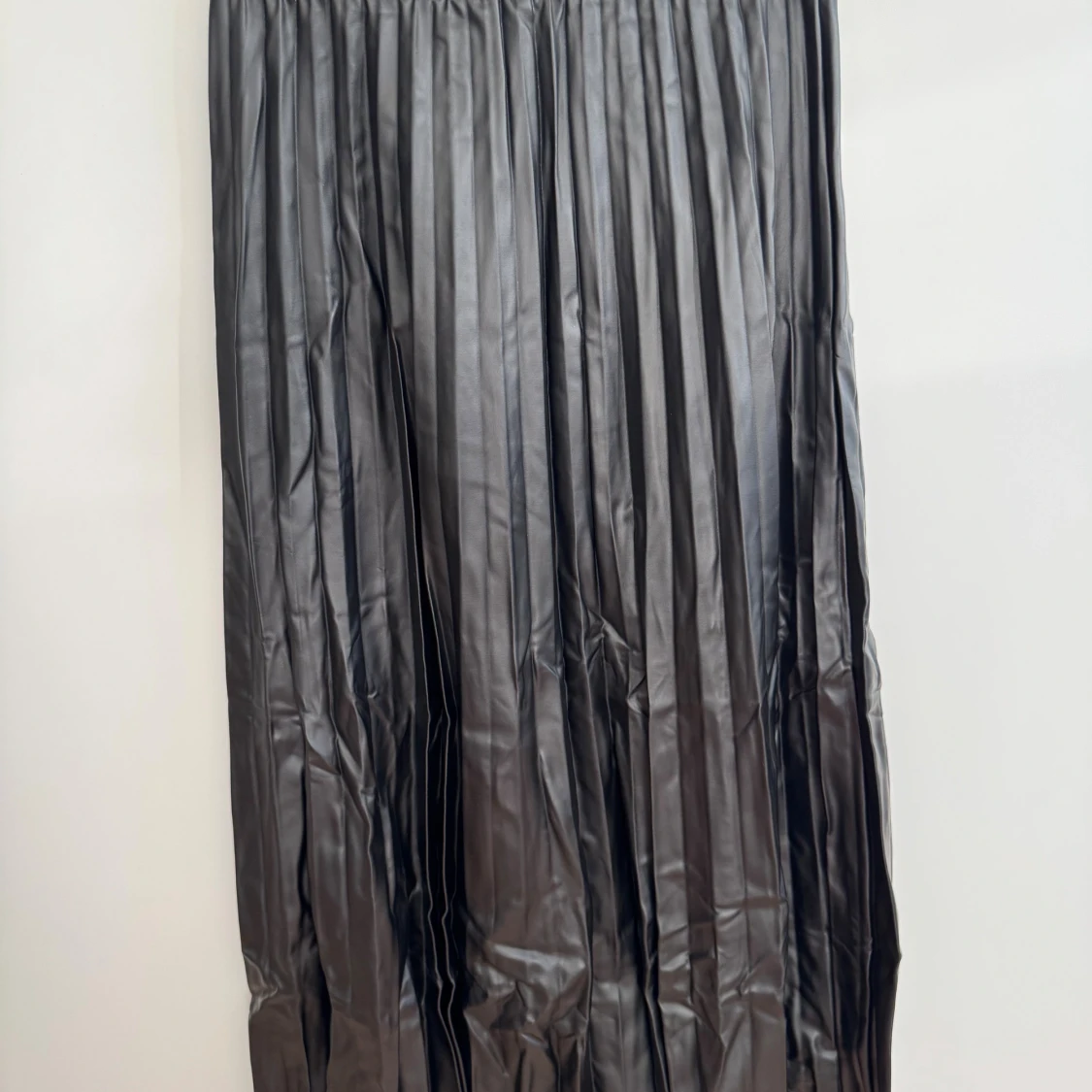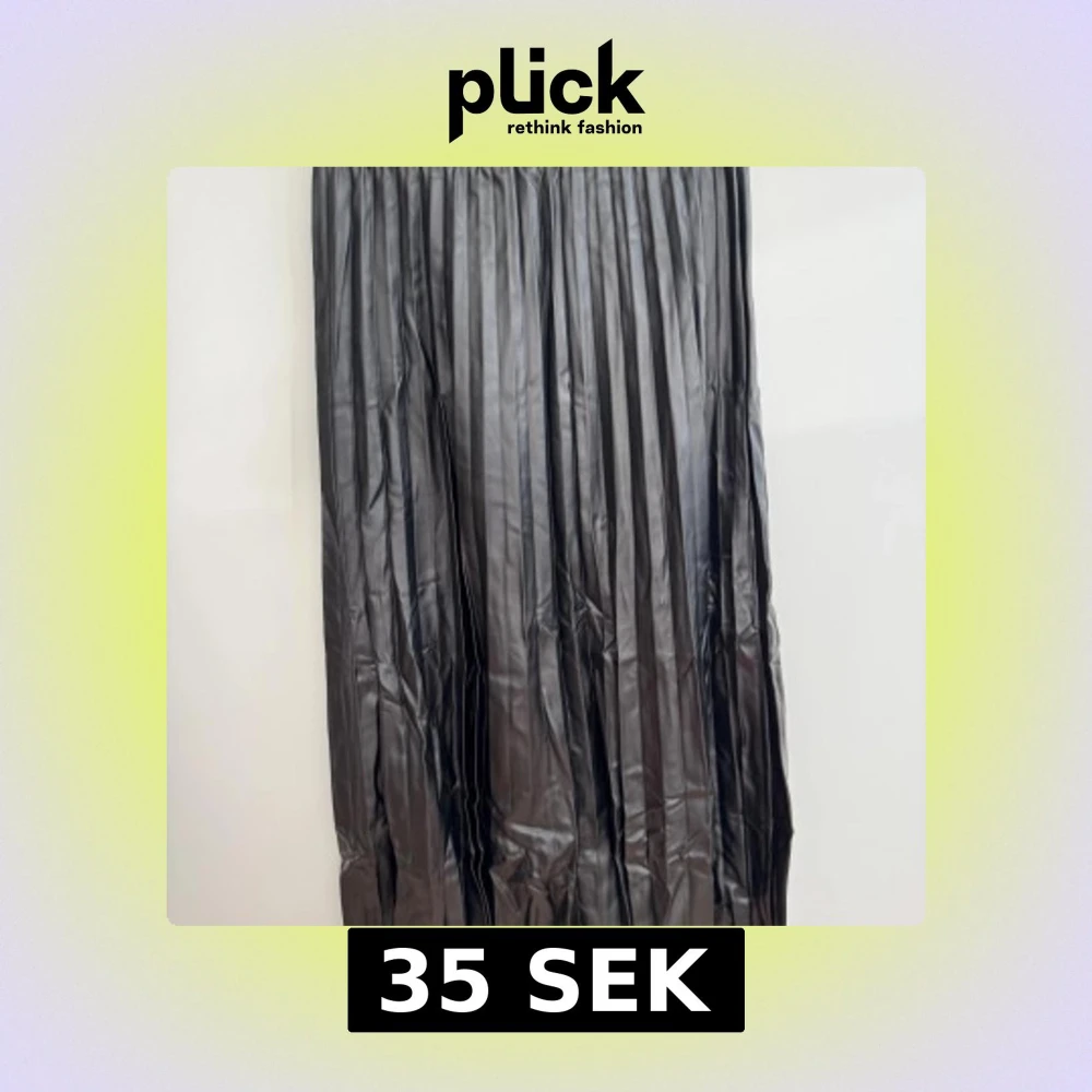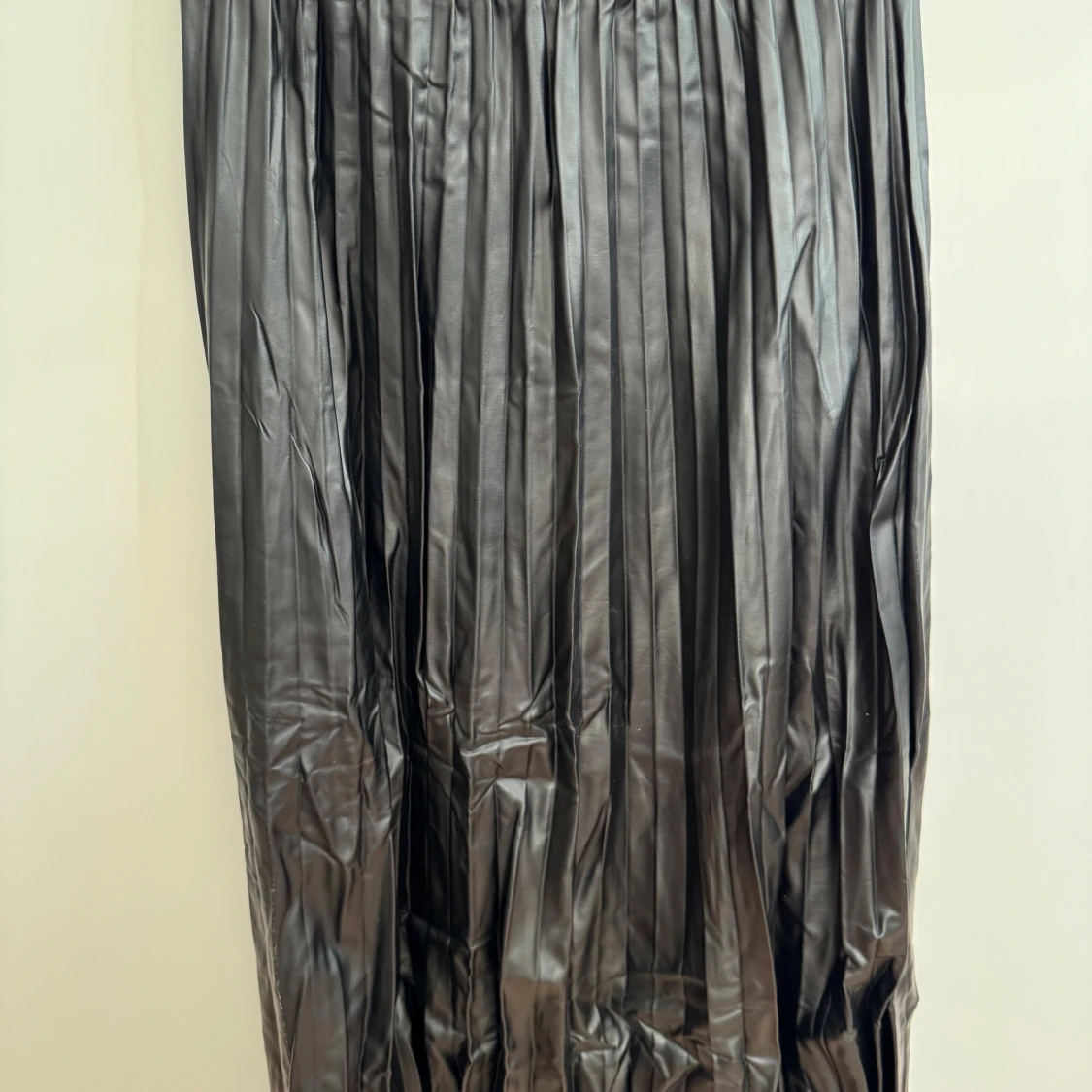 Svart plisserad midikjol från ASOS DESIGN i storlek 34/XS. Kjolen har en elastisk midja och är tillverkad av 93% polyester och 7% elastan. Har aldrig använts, men har ett märke på högra sidan som fanns redan vid leverans.