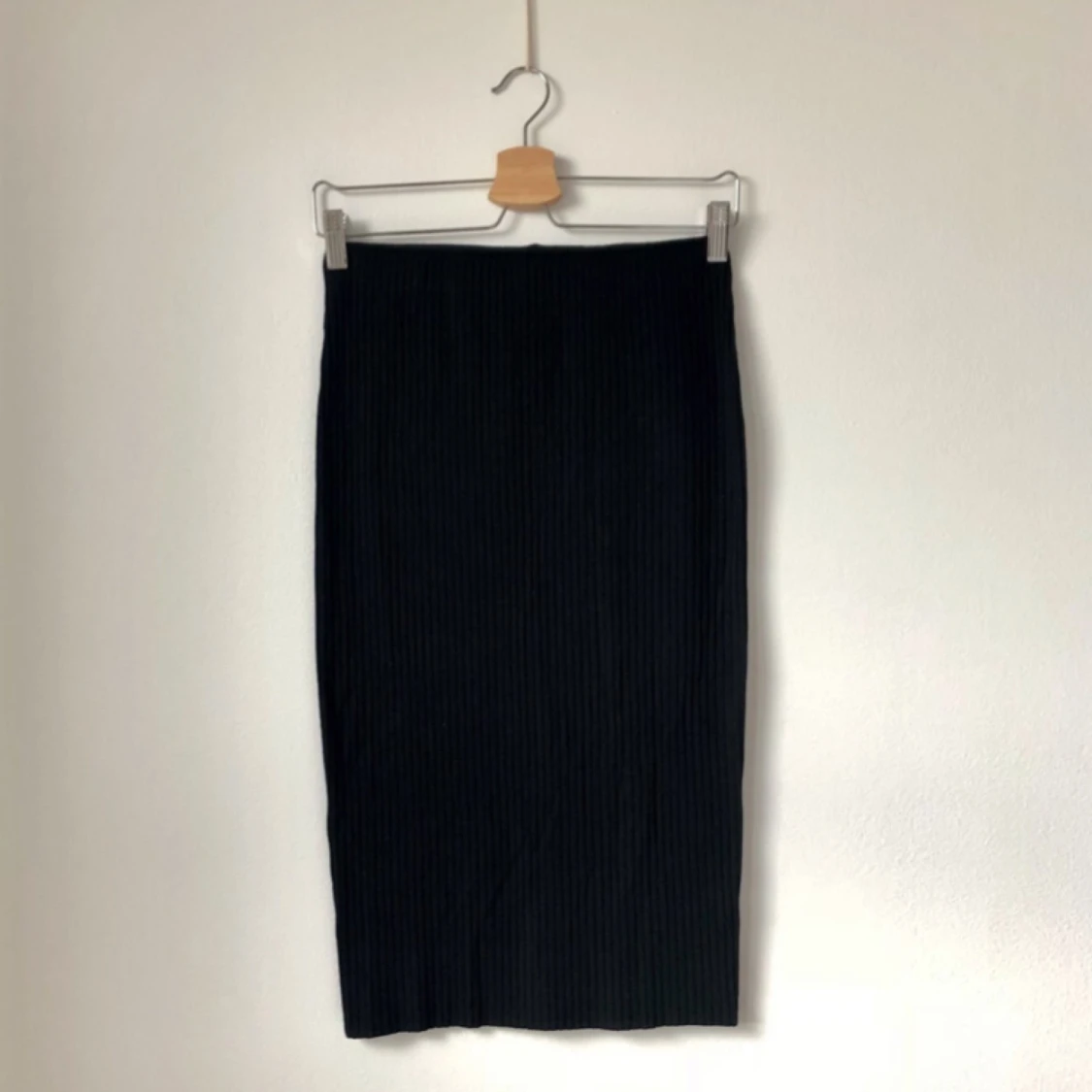Strechig ribbad kjol från Mango med liten slits baktill. Varmt mörkgrå, något ljusare än på bilderna.