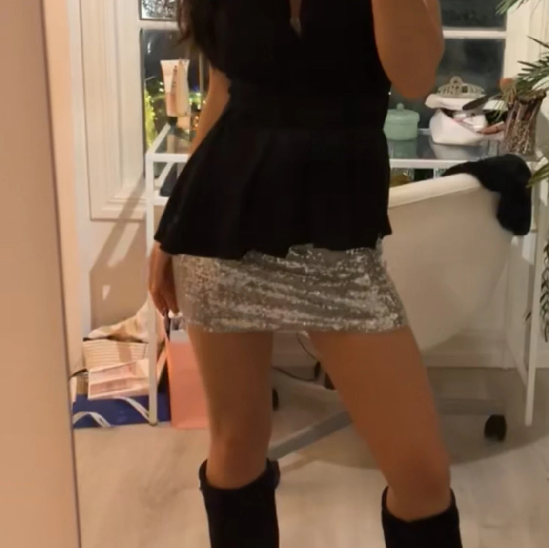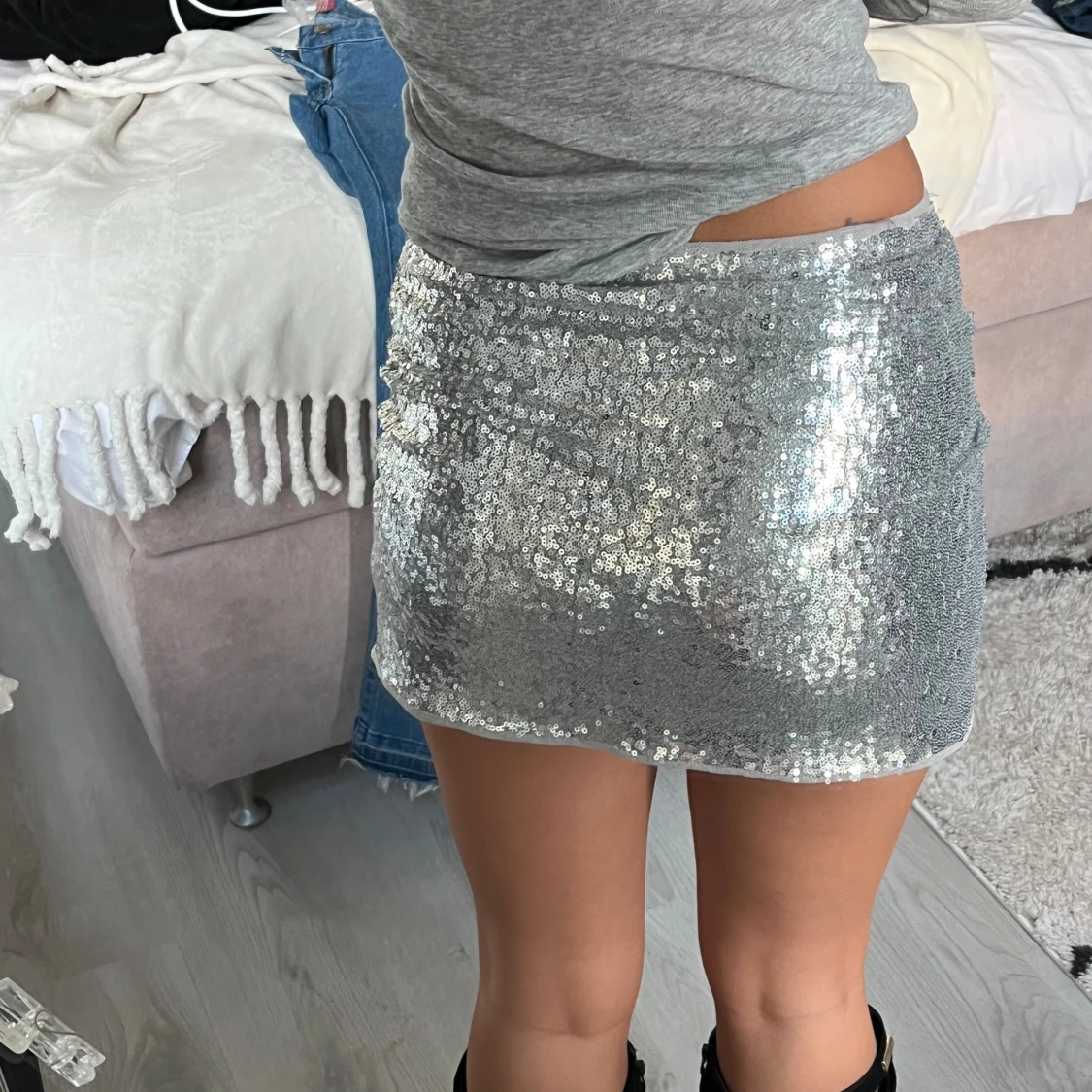 Säljer en superglittrig silverfärgad minikjol med paljetter. Kjolen är tight och kort, perfekt för att sticka ut. Den har en rak passform och är täckt av skimrande paljetter som fångar ljuset. Grym att styla med boots eller klackar för en extra cool look. 146/152 men passar mig som är xs