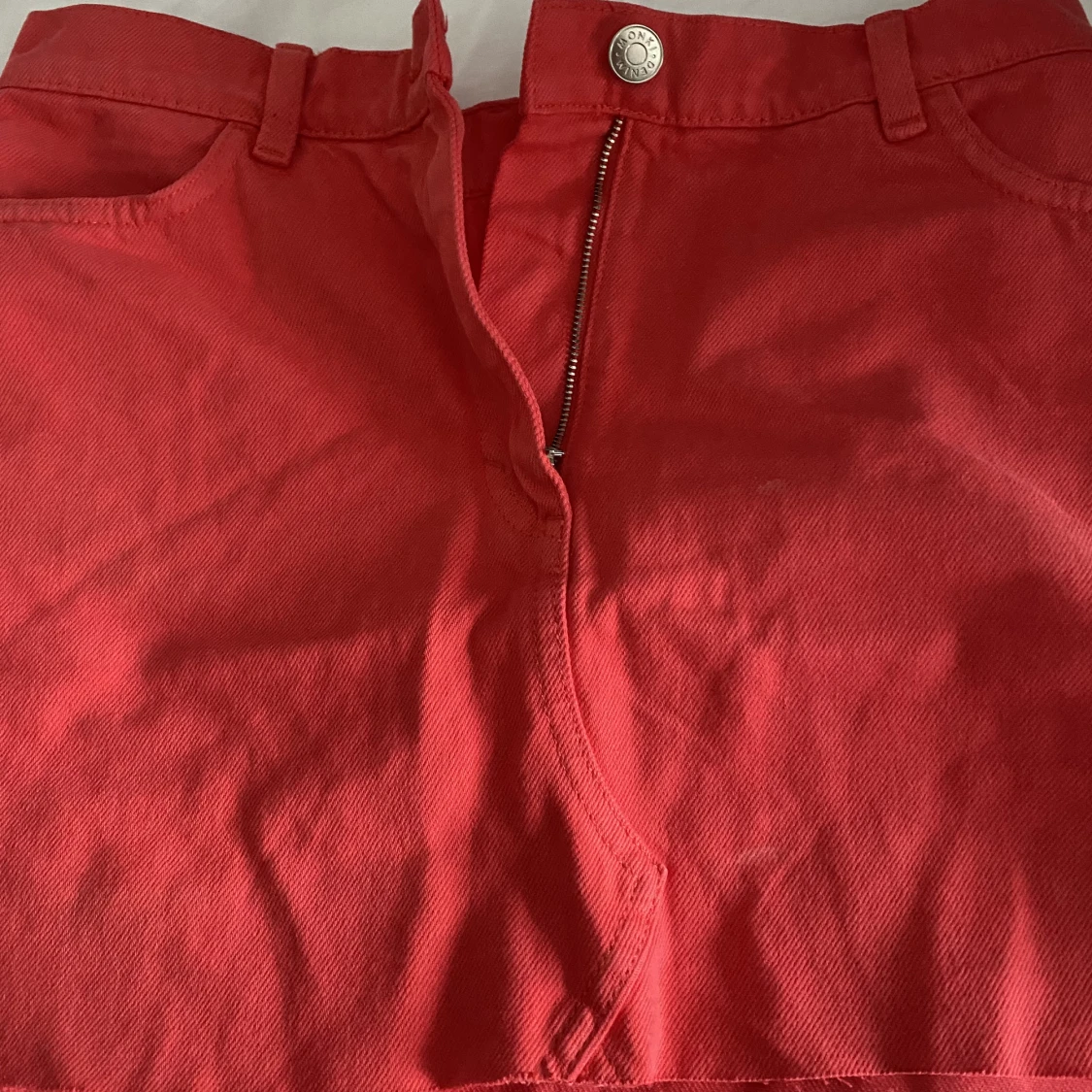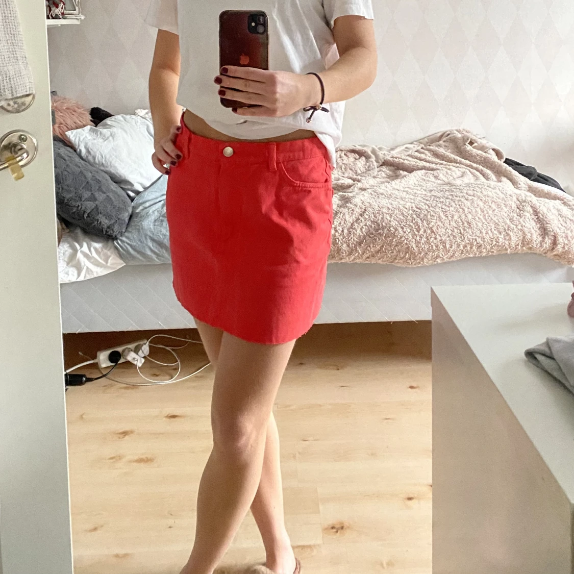 Snygg röd jeanskjol från monki❤️har klippt den för att passa mig som är 1.68, sitter lågmidjat på mig som vanligtvis har 34 i byxor. Väldigt bra skick!