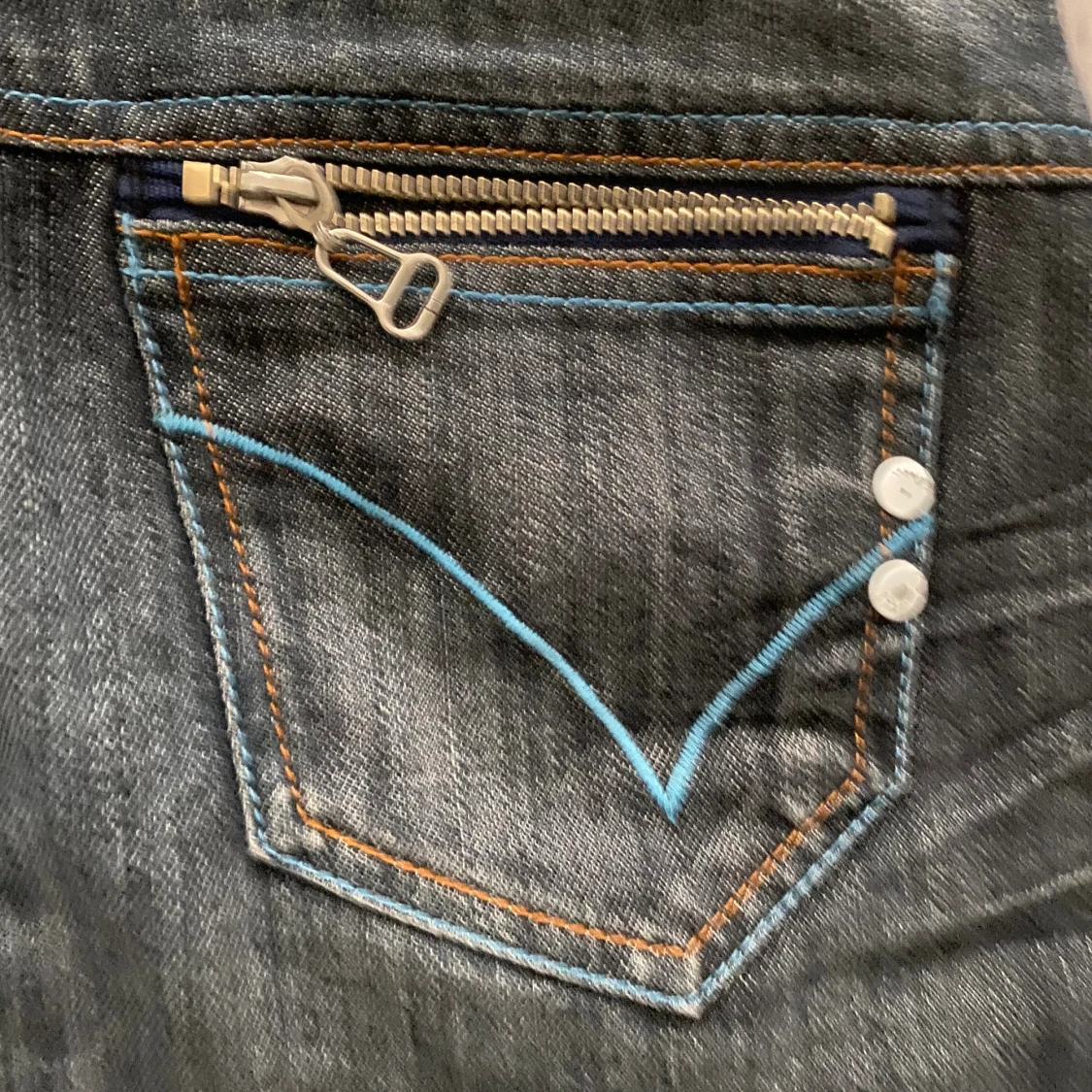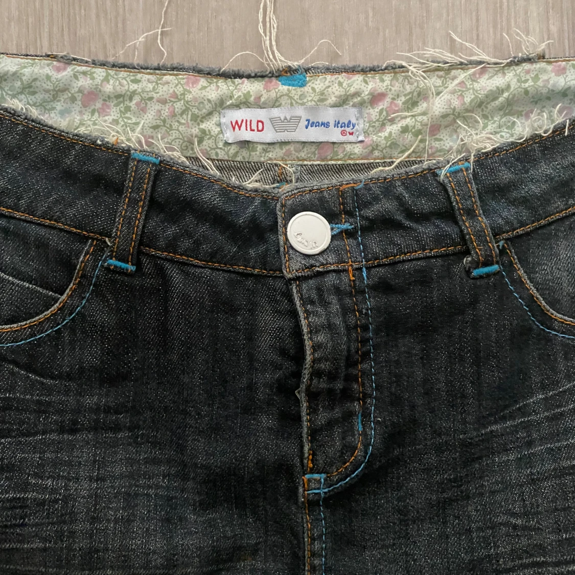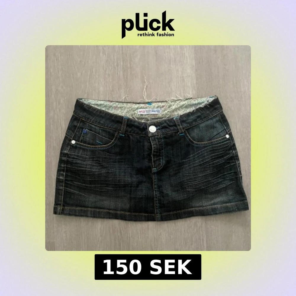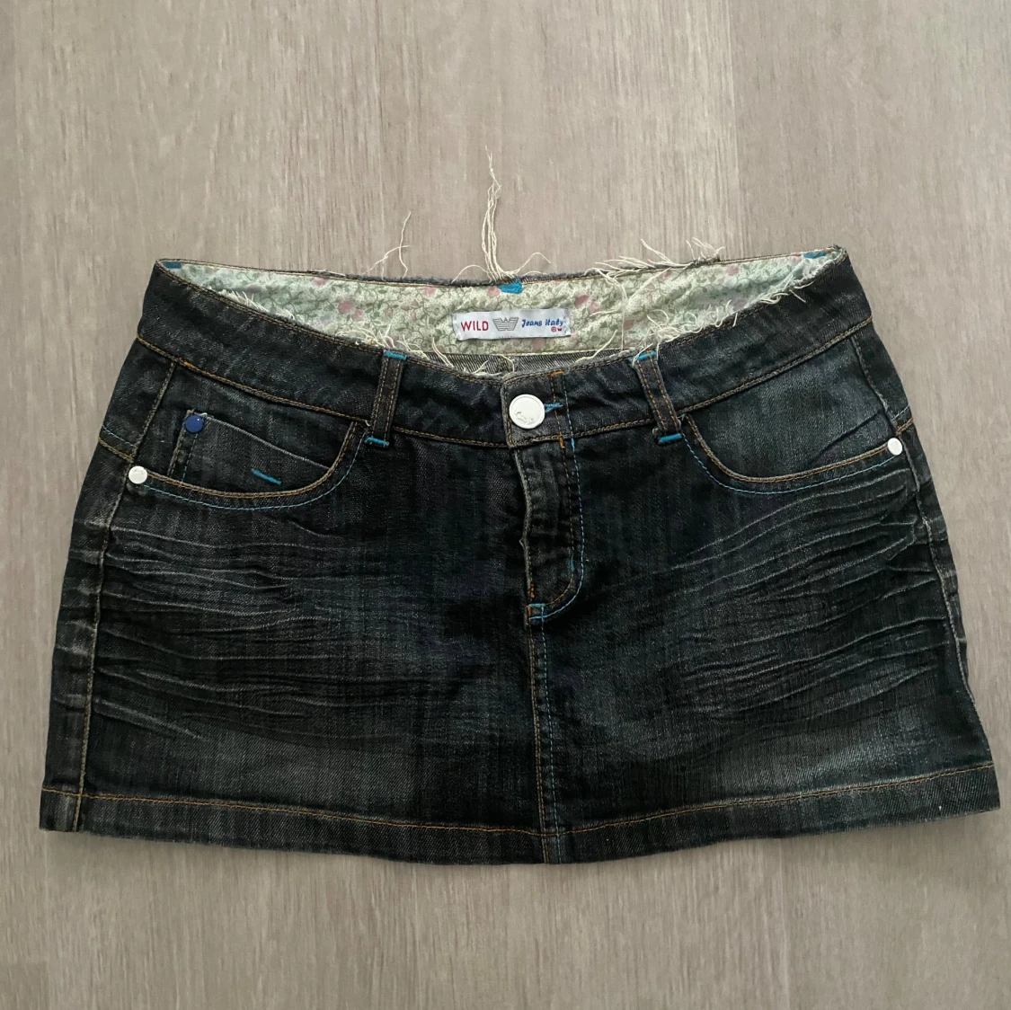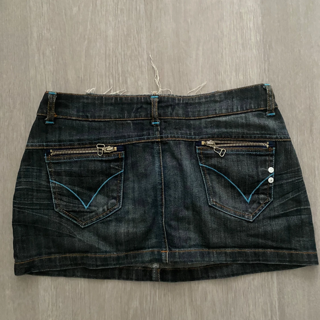 Snygg mörkblå jeanskjol med slitningar och kontrastsömmar i orange och blått. Kjolen har klassisk femficksdesign, bälteshällor och coola dragkedjor på bakfickorna. Perfekt för dig som gillar en edgy och trendig look.