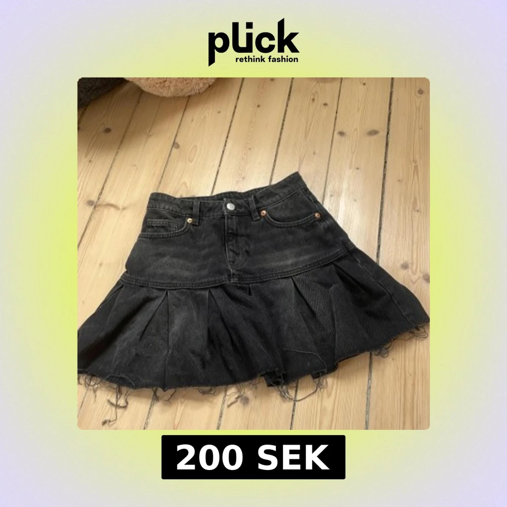 Säljer en svart jeanskjol från Monki med plisserad nederdel och rå, fransig kant. Kjolen har klassiska jeansdetaljer som fickor och knappstängning framtill. Perfekt för dig som gillar en edgy och cool stil.