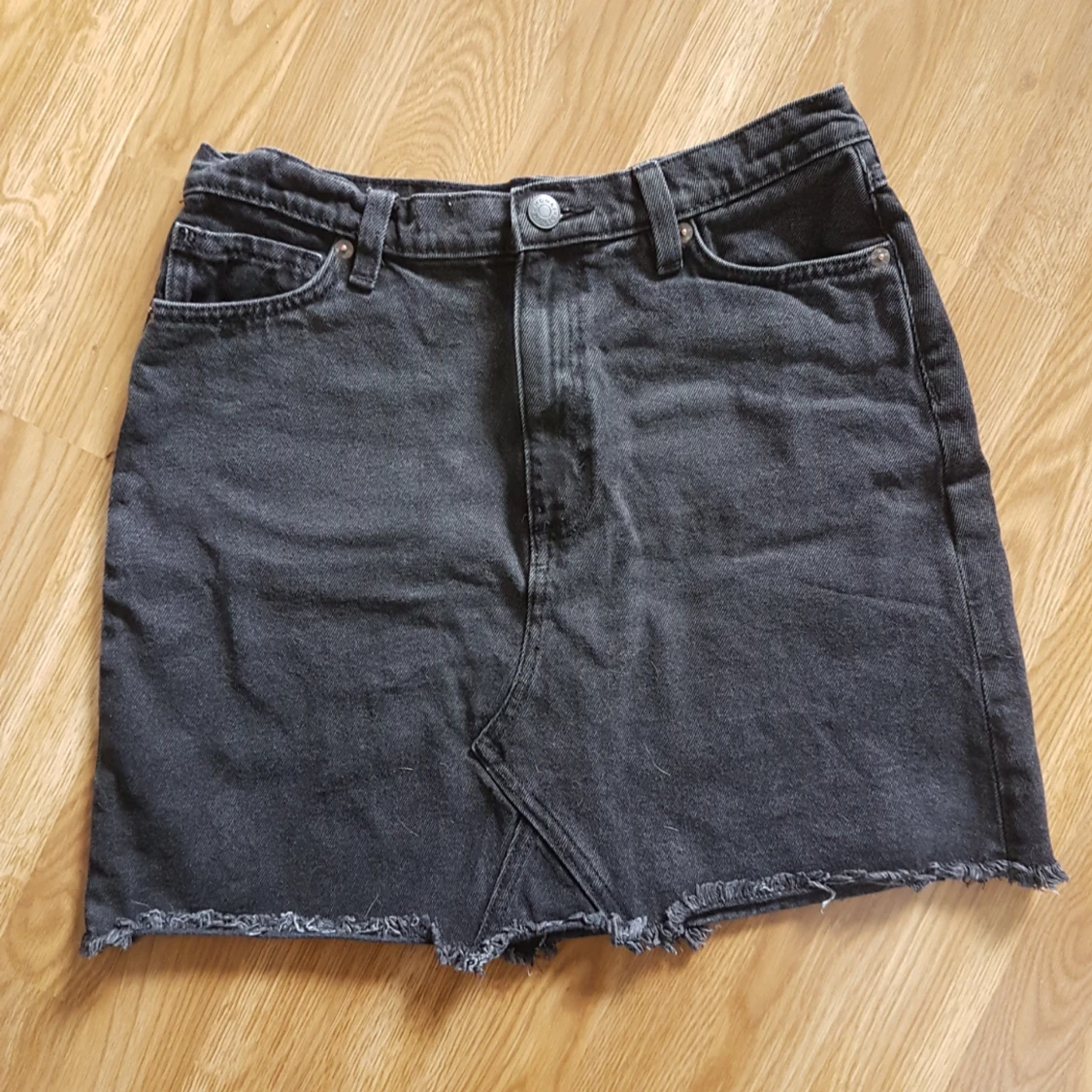 Svart/grå jeanskjol med fransad kant. Strl 40, har dock krympt en aning i tvätten. Frakt 20kr🌿