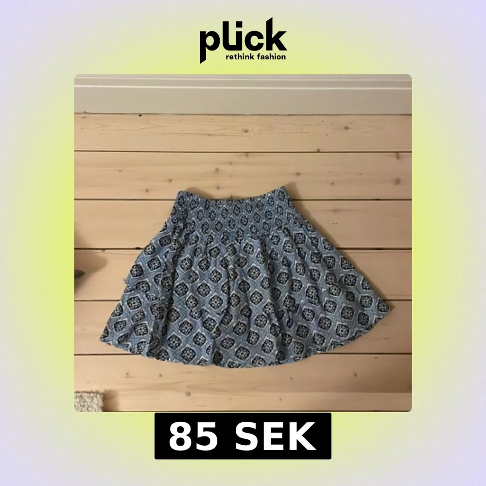 Kortkjol från Gina Tricot i blått med beige och mörkblått mönster. Kjolen har smock i midjan och ett flowigt fall. Perfekt för varma dagar och enkel att matcha med en enkel topp.