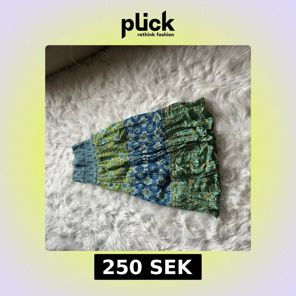 Supersöt kjol från Zara i storlek S med färgglada blå och gröna toner och ett unikt mönster. Kjolen har resår i midjan och är lätt utställd med flera volanger. Perfekt för dig som gillar boho-vibes och vill sticka ut lite extra. Köpt men aldrig använd