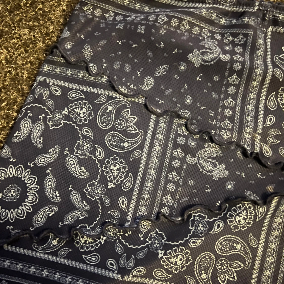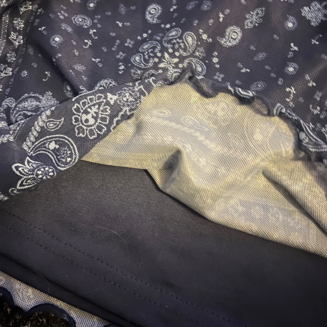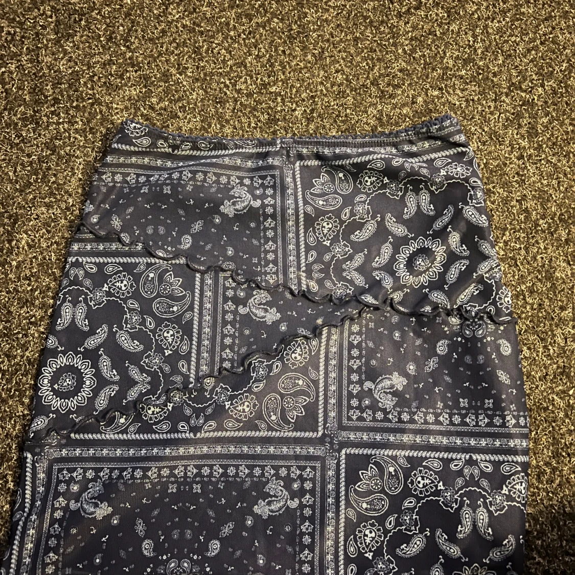 Snygg kjol med ett klassiskt paisley-mönster i blå/mörkblått och vitt. Kjolen har en rak passform och är perfekt för att ge en stilren touch till din outfit. Materialet känns mjukt och bekvämt mot huden. Samma mönster som klänningen innan.