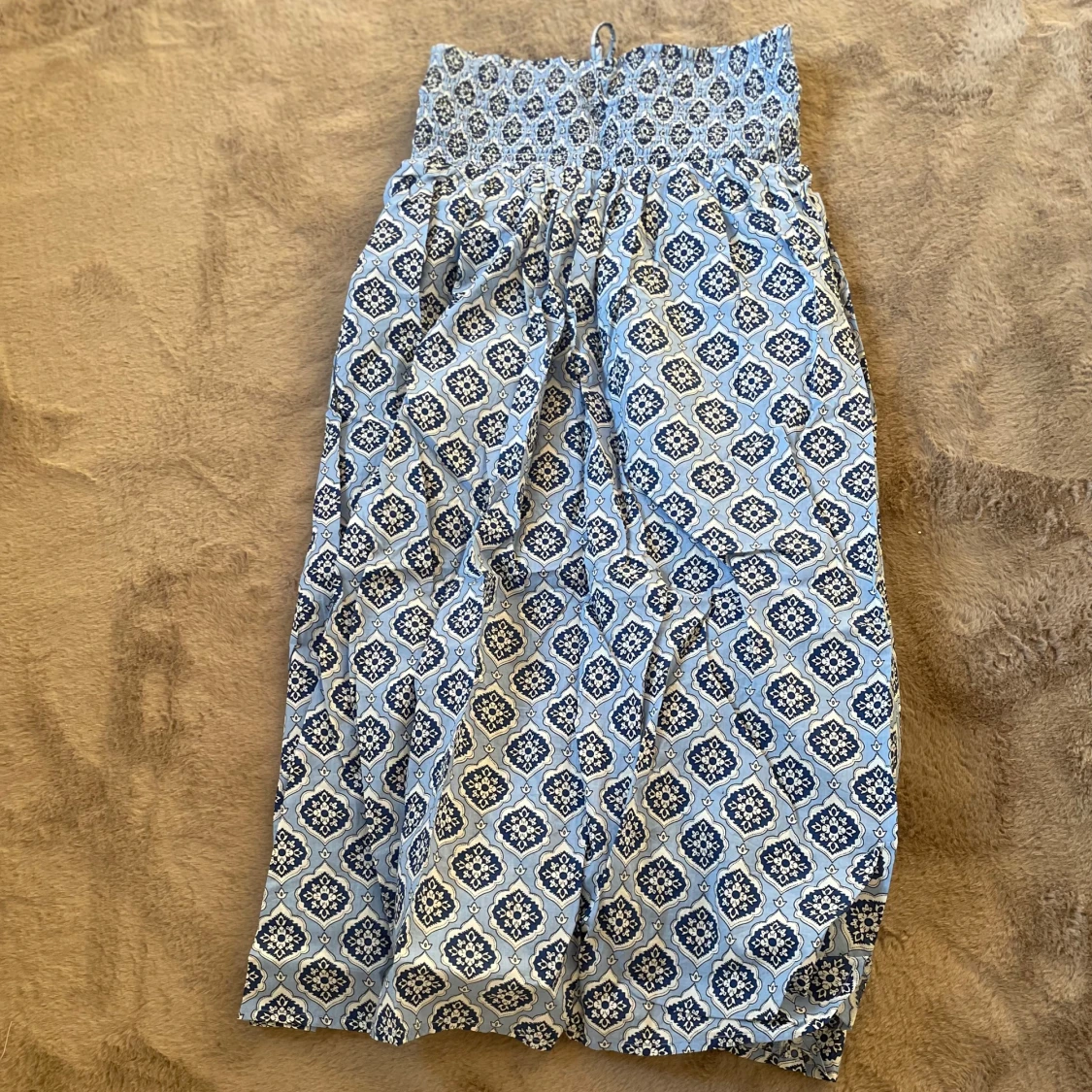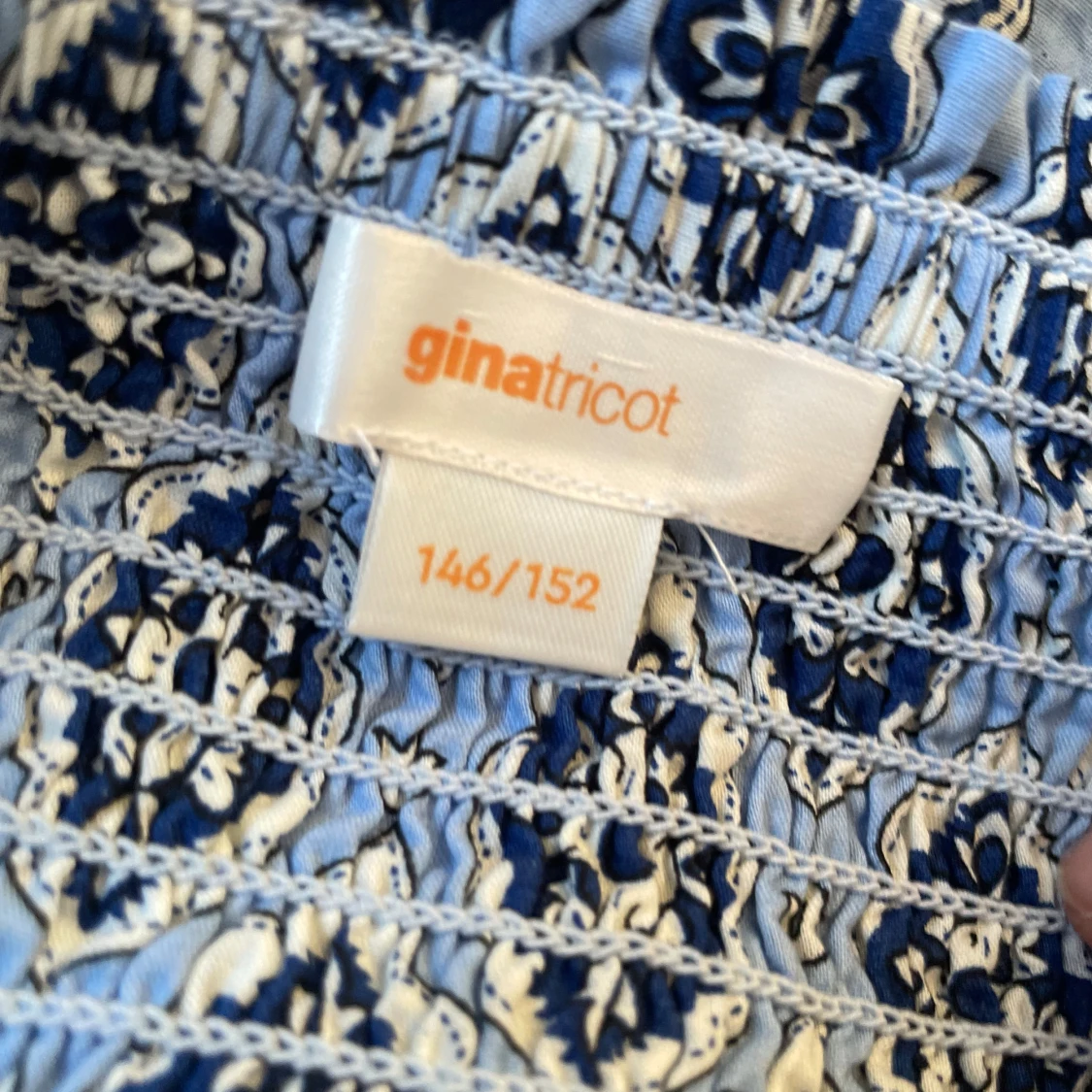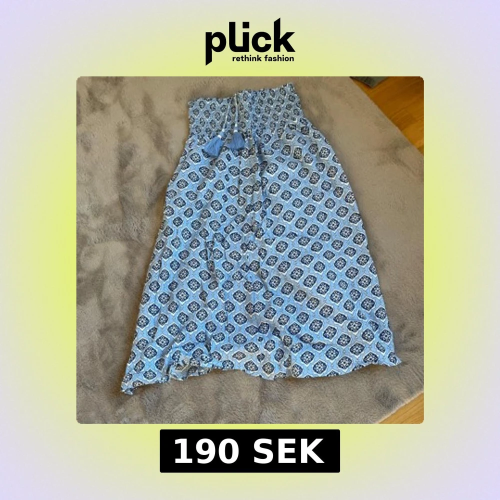 Säljer en blå och vit mönstrad kjol från Gina Tricot. Kjolen har en smockad midja och ett fint mönster med volangdetaljer. Perfekt för varma dagar!