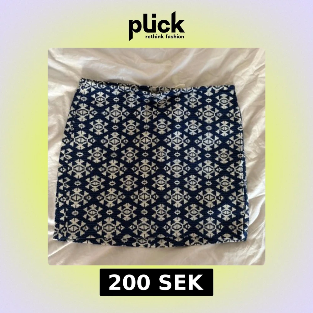Det är en Mönstrad kortare kjol från Hm. Den är blå och vit och har en dragkedja. I mycket bra skick!