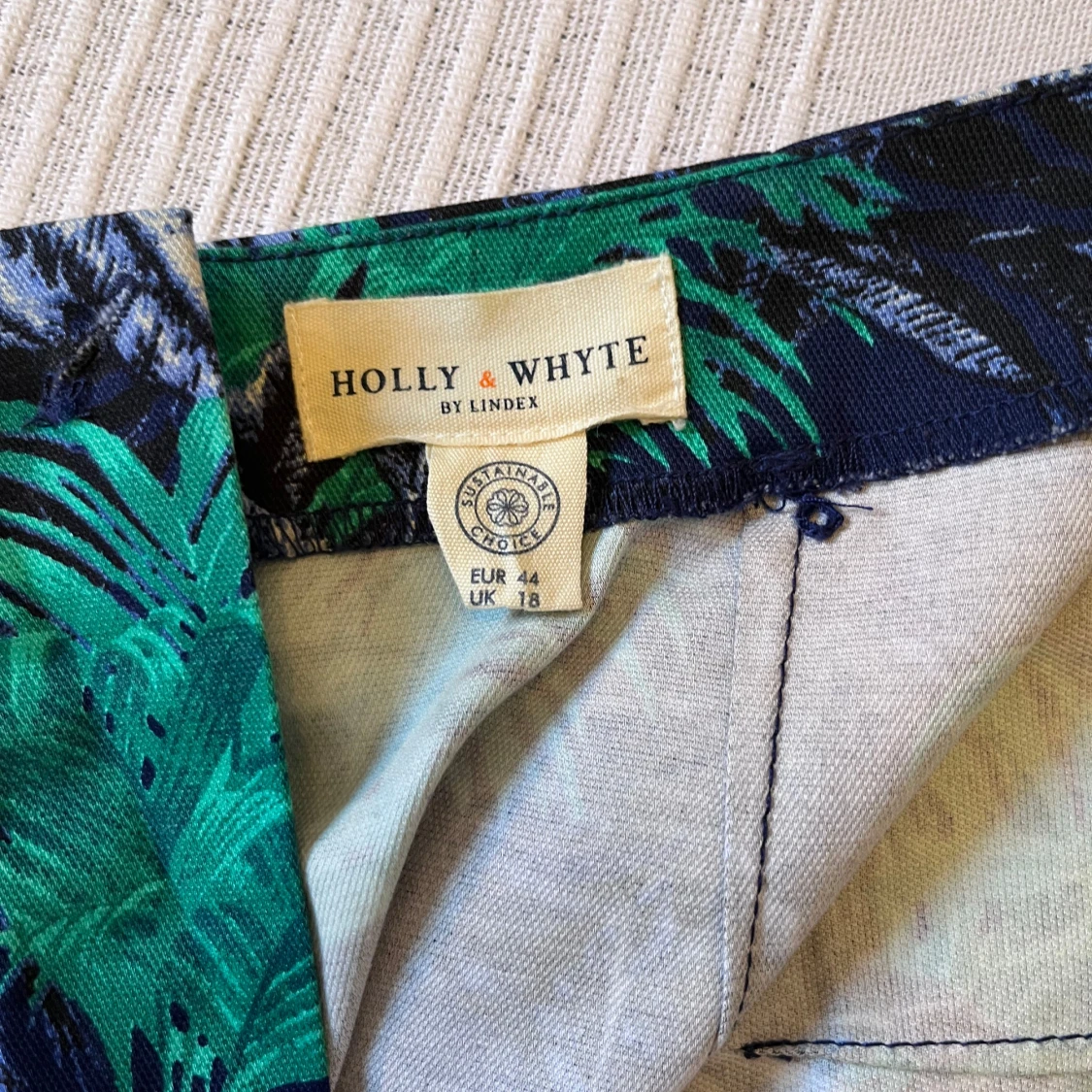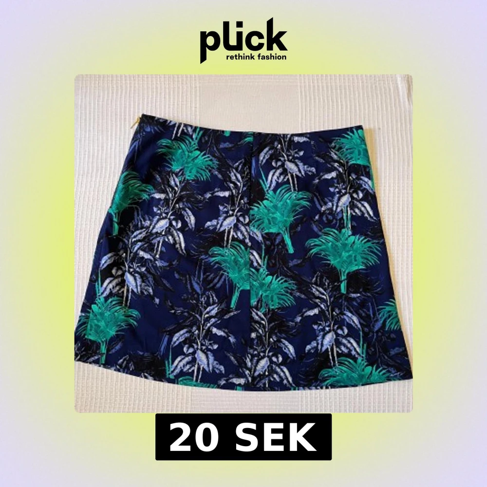 Snygg kortkjol från Holly & Whyte by Lindex i marinblått med grönt och vitt palmbladsmönster. Kjolen har en guldig dragkedja i sidan och är tillverkad i ett stadigt bomullstyg. Perfekt för dig som vill sticka ut med tropiska vibes.
